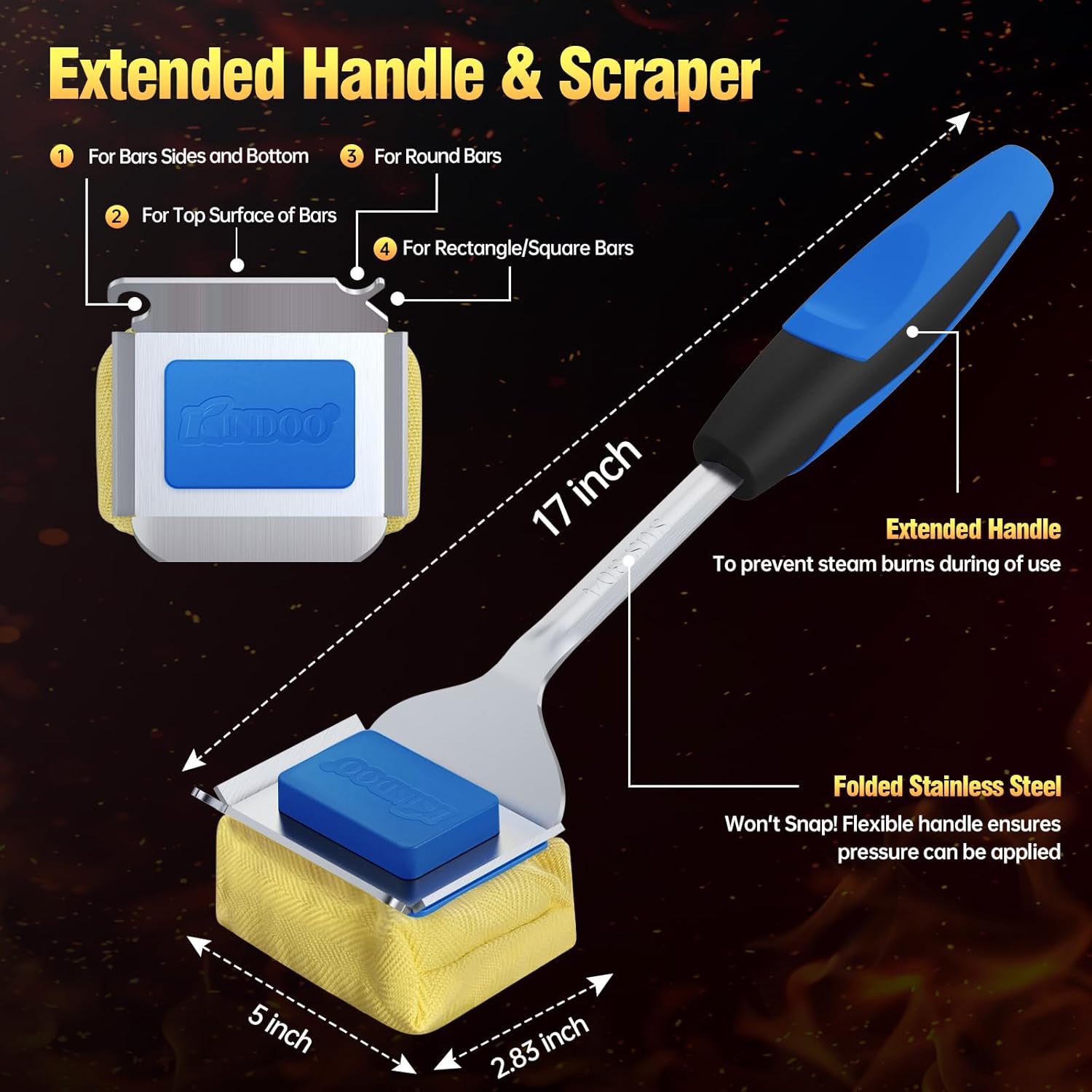 - 【Tough Debris Killer】 A thoughtful angled upward design ensures a handy to use experience.Through the precise contact angle, easily remove debris of top,side and bottom.The brush head is equipped with a versatile scraper which is designed for all shapes of grill bars, including round, square, and rectangle.The grill brush and scraper is safe to use on any type of grill, including charcoal, gas, porcelain, ceramic, cast iron or stainless steel grills