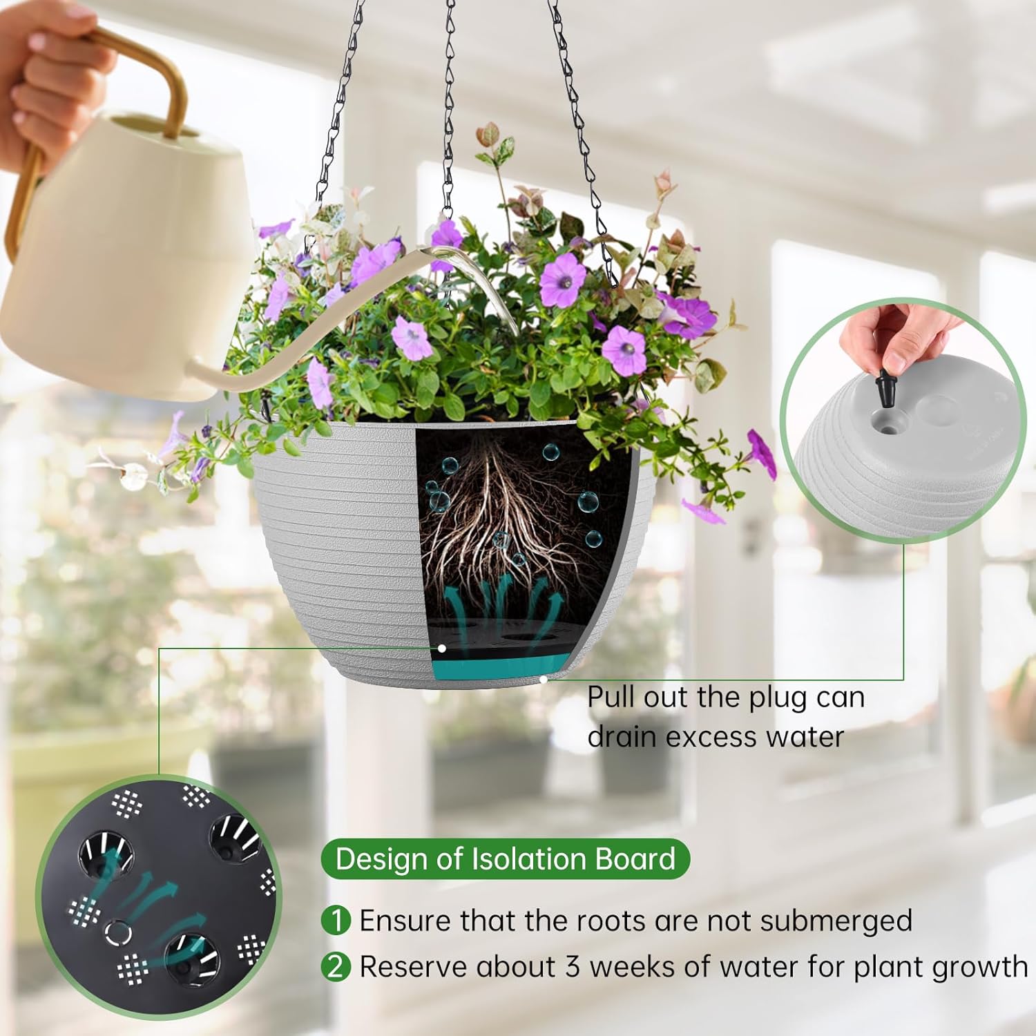 - Lazy self watering planting method reduces the trouble of daily watering, and high-level drainage hole prevent excessive drainage. Once water-storage can last for about 3 weeks