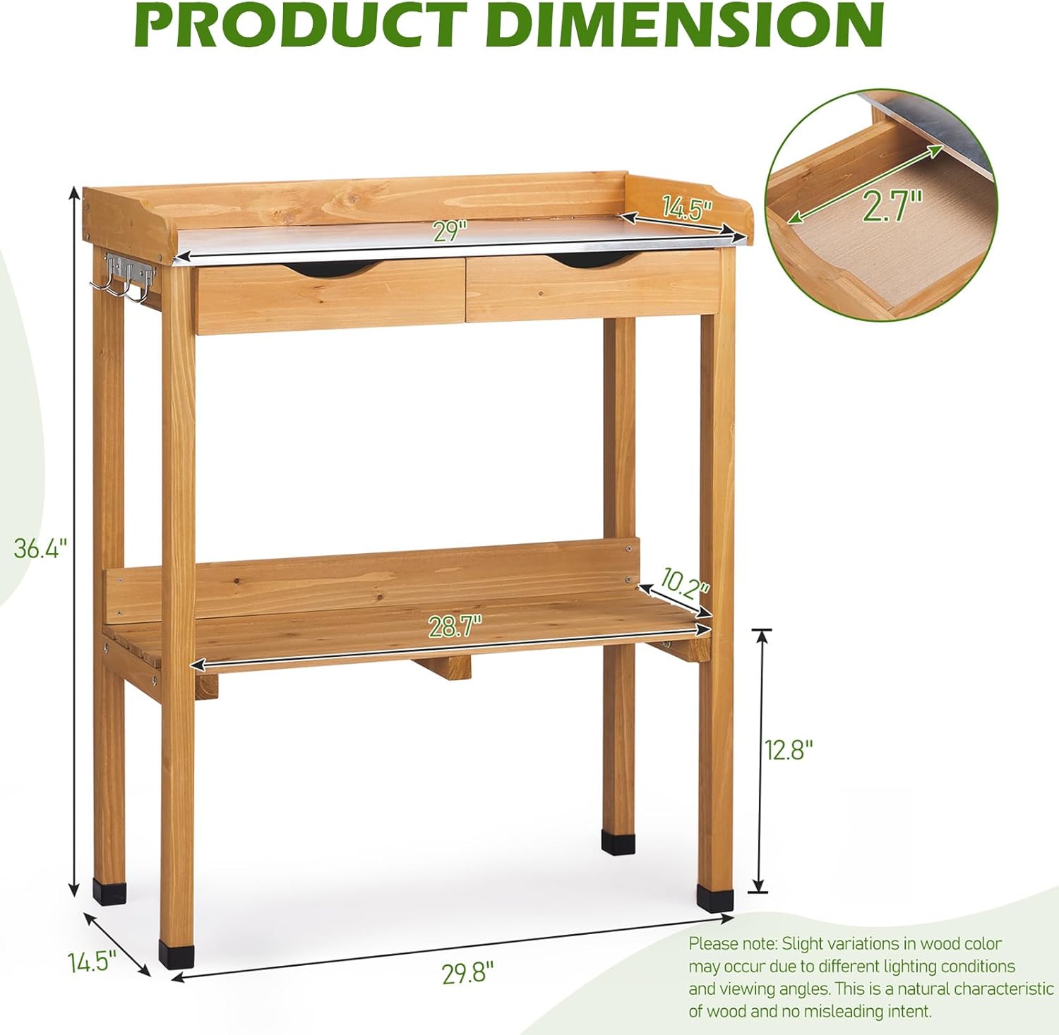 Outdoor Potting Bench Garden Work Station, Solid Wood Planting Table w/Sink Drawer Shelves,Metal Top, Folding Patio Furniture for Porch Balcony (29.8 x 14.6 x 36.4(Fir Wood Color))