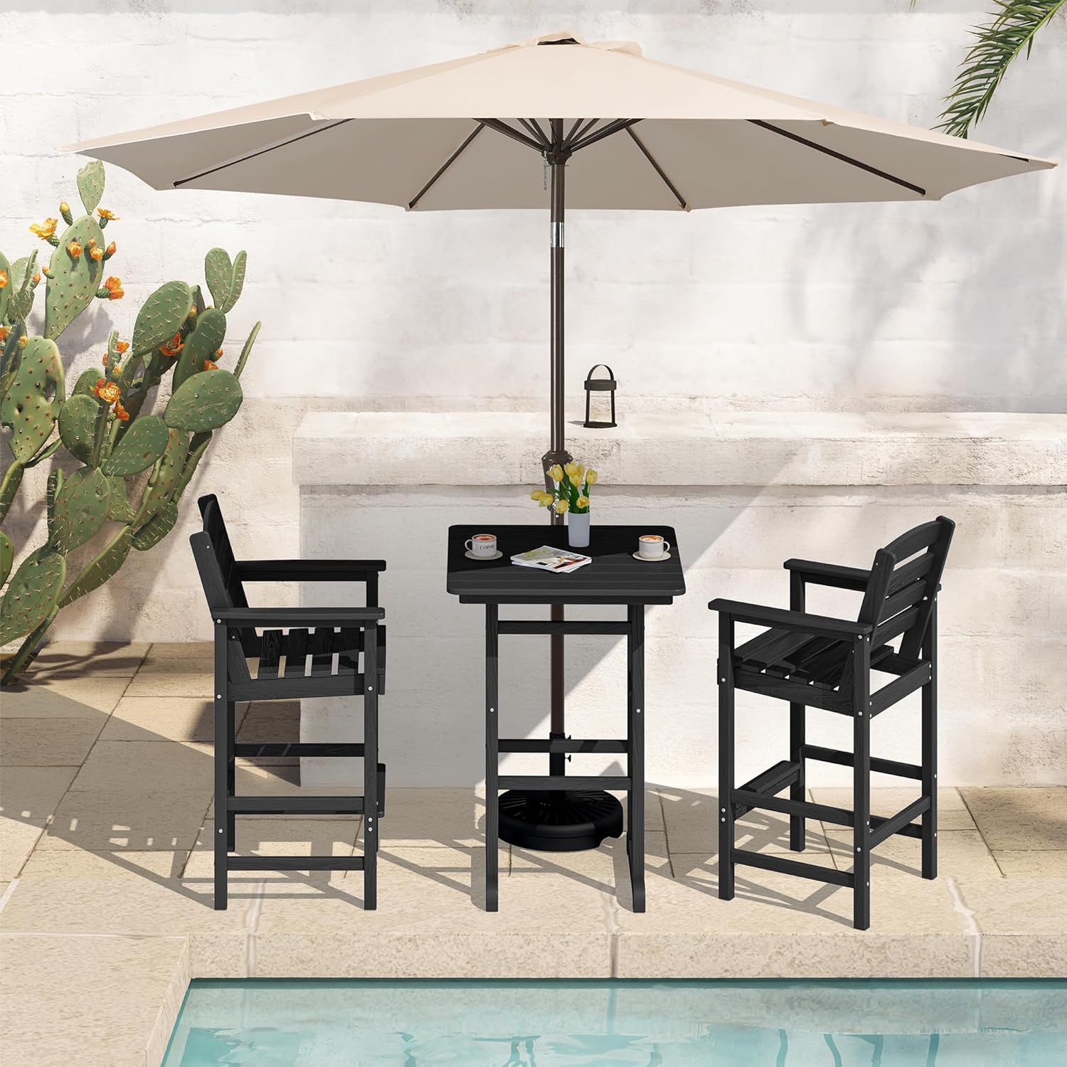 SERWALL 4 Pieces Outdoor Patio Bar Set with 9ft Umbrella, Outdoor HDPE Barstool and Table Furniture Set with Patio Umbrella, Black