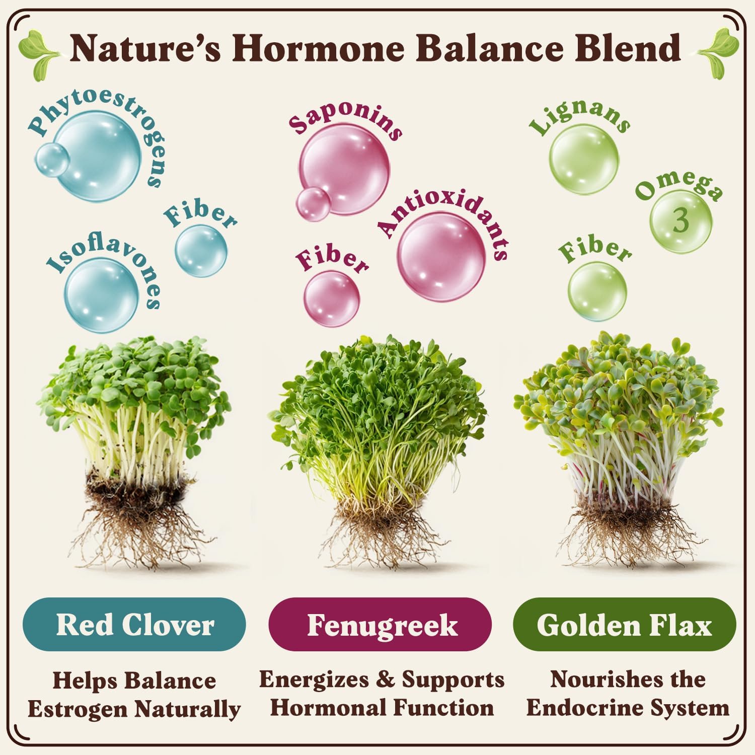 - Hormone-Balancing Sprouts in Days – Grow your own wellness with a blend of red clover, golden flax, and fenugreek seeds—rich in phytoestrogens and lignans to help support hormone balance, ease PMS and menopause symptoms, and boost energy. With high germination rates and fresh flavor in just days, these sprouts make it easy to nourish your body naturally—right from your kitchen.
