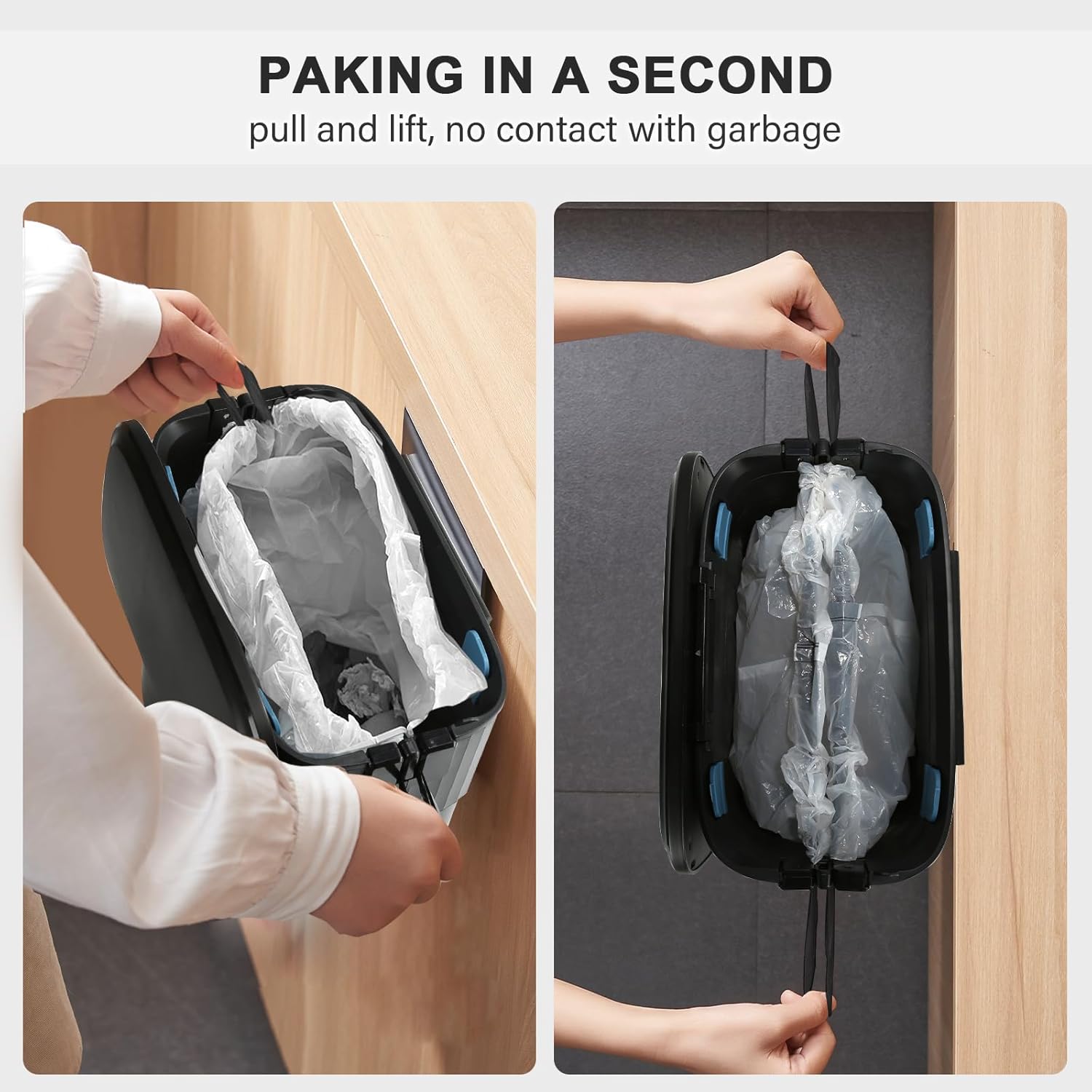 - Drawstring Design - The hanging garbage cans come with a convenient drawstring design that allows you to quickly pack garbage bags without getting your hands dirty, and the built-in spring makes it easy to pull the bags without tearing them.