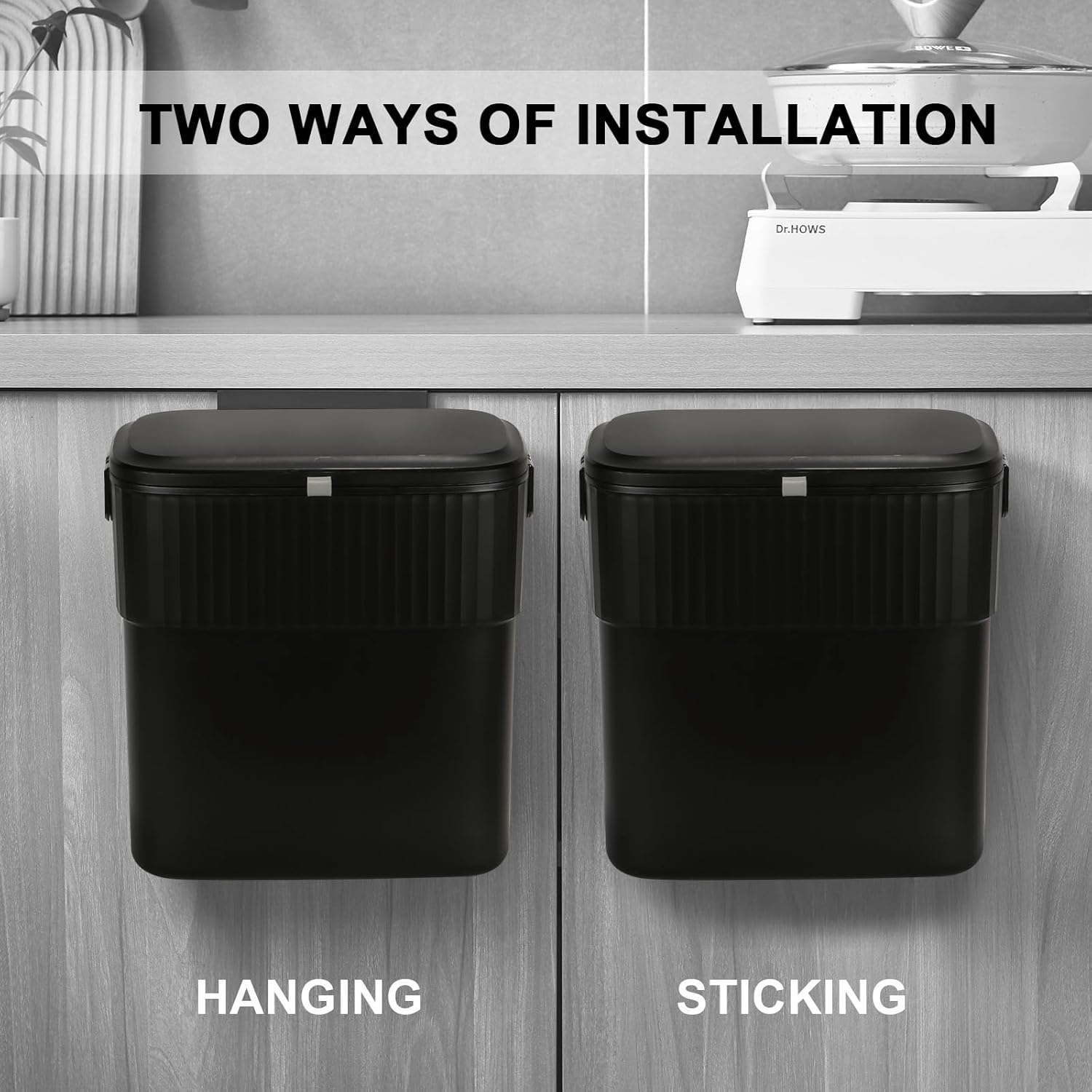- Wall-mounted/Hanging Trash Can - This trash can has two different types of support components, both of which are easy to install, and you can install them in any position you find most comfortable. The one with adhesive strip on the back is for customers to place on a flat and clean vertical surface like bathroom wall. The other one can be hung on both sides of any cabinet door that is not thicker than 1 inch.