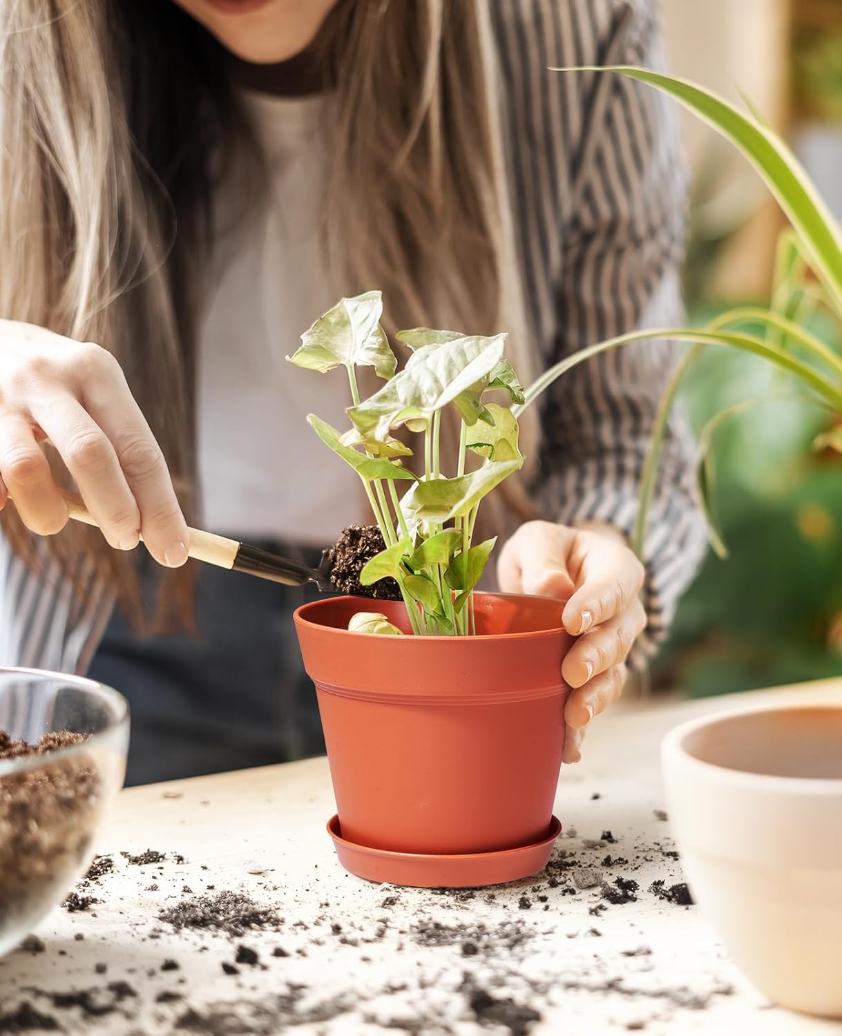 - 【Elegant and Refreshing Design】The surface of the planting pots is very smooth and the appearance is fresh and elegant,and it looks very comfortable to grow house plants.If you are looking for a minimally decorated indoor planter,these small growing pots is an excellent choice.