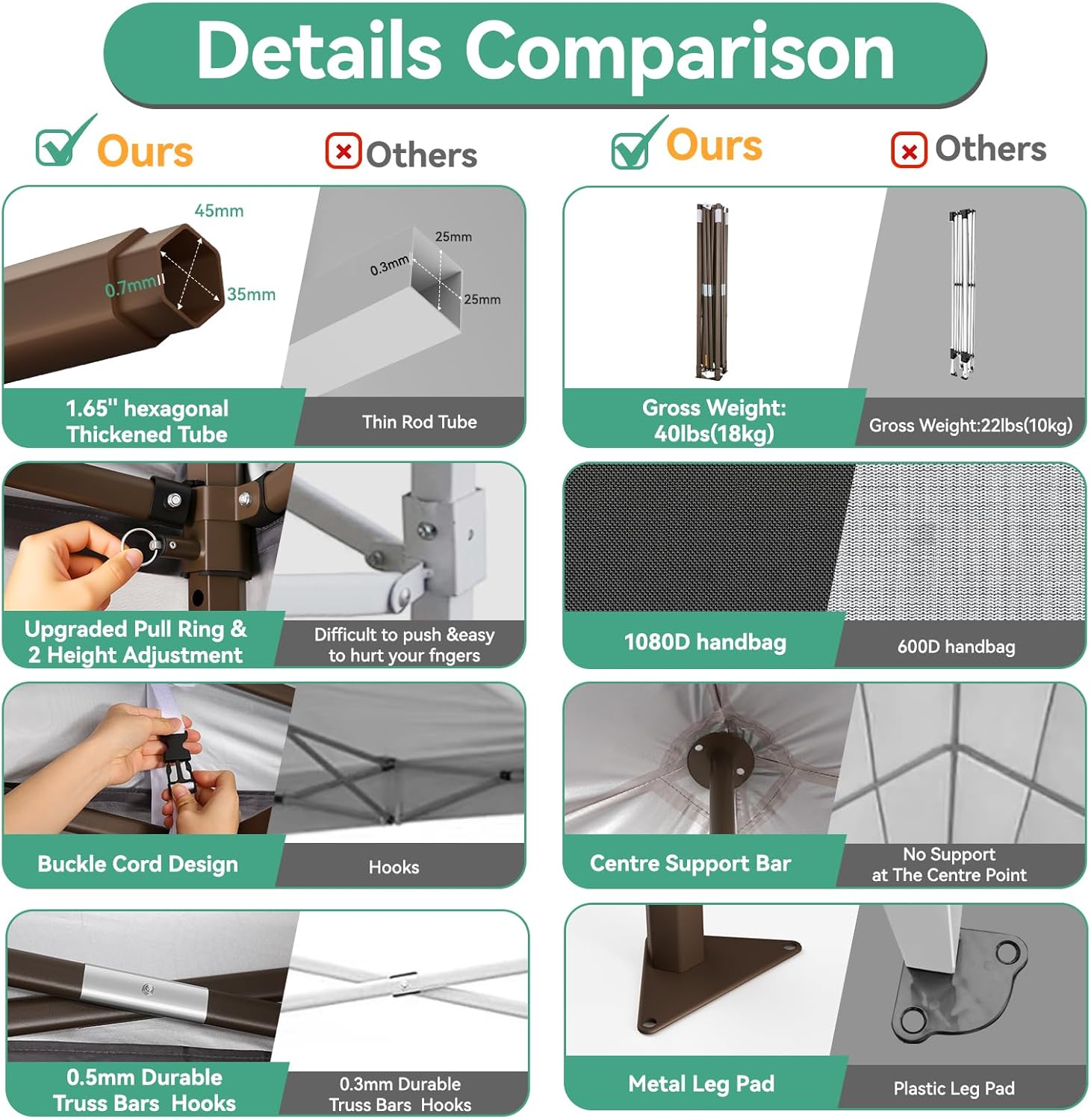 - [Premium Quality Fabric] 10x10 pop up canopy tent is made of 420g waterproof oxford fabric. The top fabric is coated with two layers of PVC with heat-sealed seams waterproof strip technology, 100% waterproof and blocks 99% UV rays.PVC coated top fabric has better light transmission than other silver coated top fabrics on the market, the tent space is more transparent.