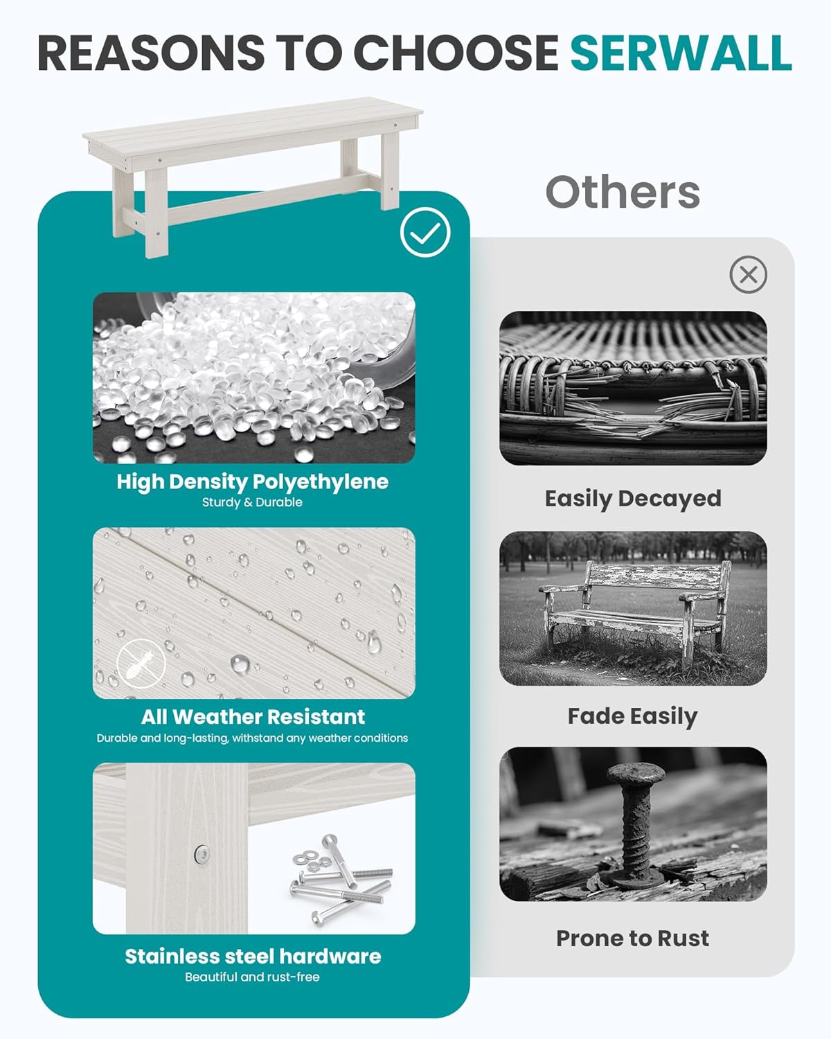- All-Weather Resistant: The SERWALL garden bench is made of durable high-density polyethylene (HDPE), along with 304 stainless steel hardware, making it resistant to various weather conditions and ensuring long-lasting durability. It is an ideal choice for any outdoor environment.