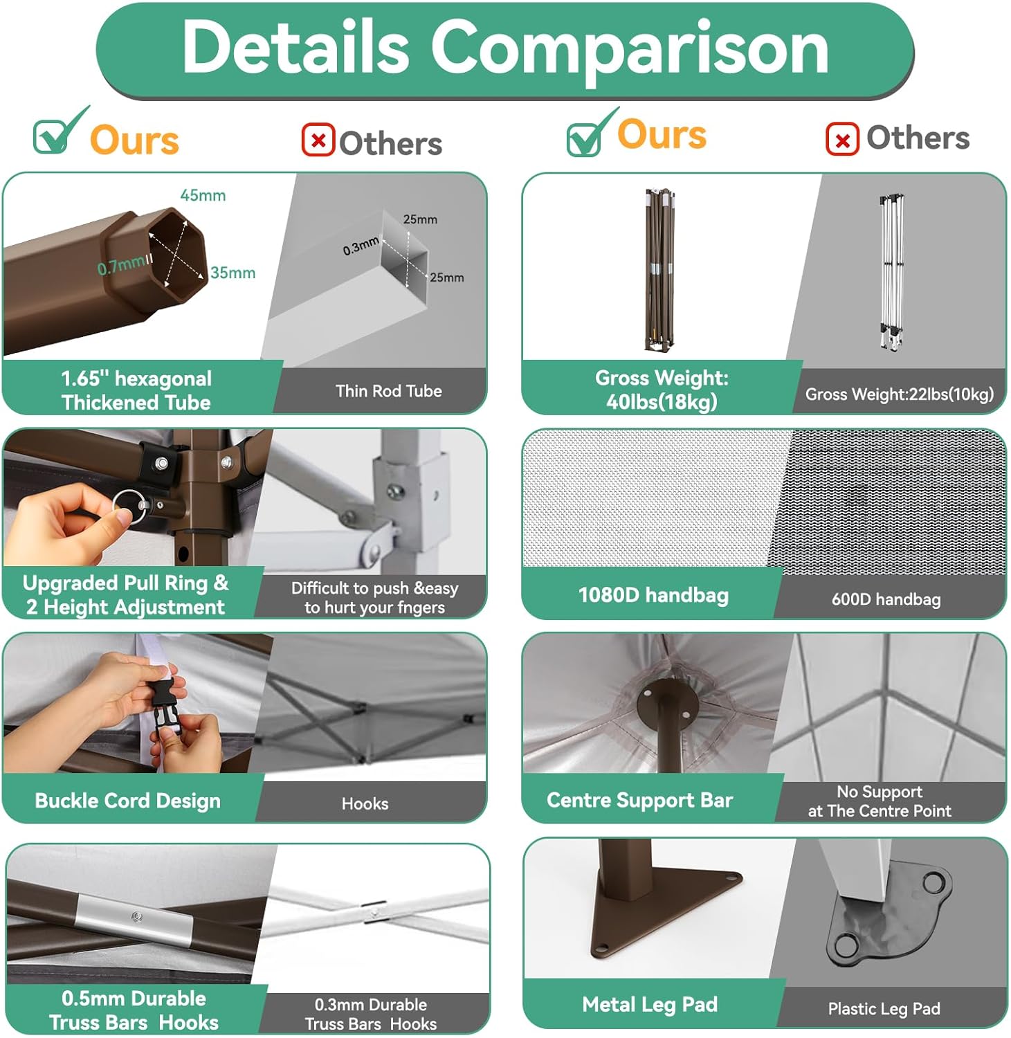 - [Premium Quality Fabric] 10x10 pop up canopy tent is made of 420g waterproof oxford fabric. The top fabric is coated with two layers of PVC with heat-sealed seams waterproof strip technology, 100% waterproof and blocks 99% UV rays.PVC coated top fabric has better light transmission than other silver coated top fabrics on the market, the tent space is more transparent.