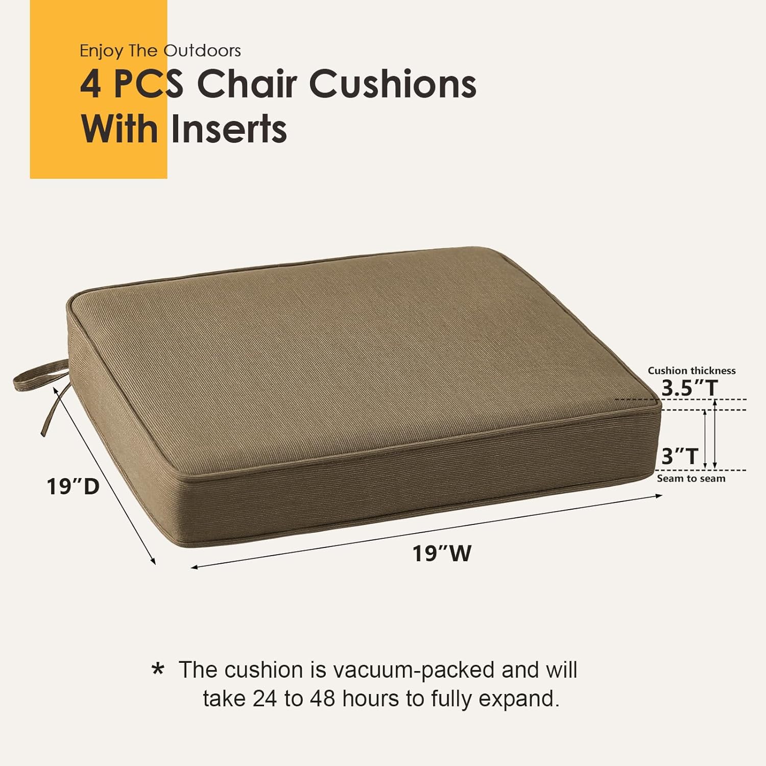 - Please measure the seat dimensions of your furniture before ordering. Sunbrella outdoor chair cushions measure 19" x 19" x 3", suitable for most patio chairs.