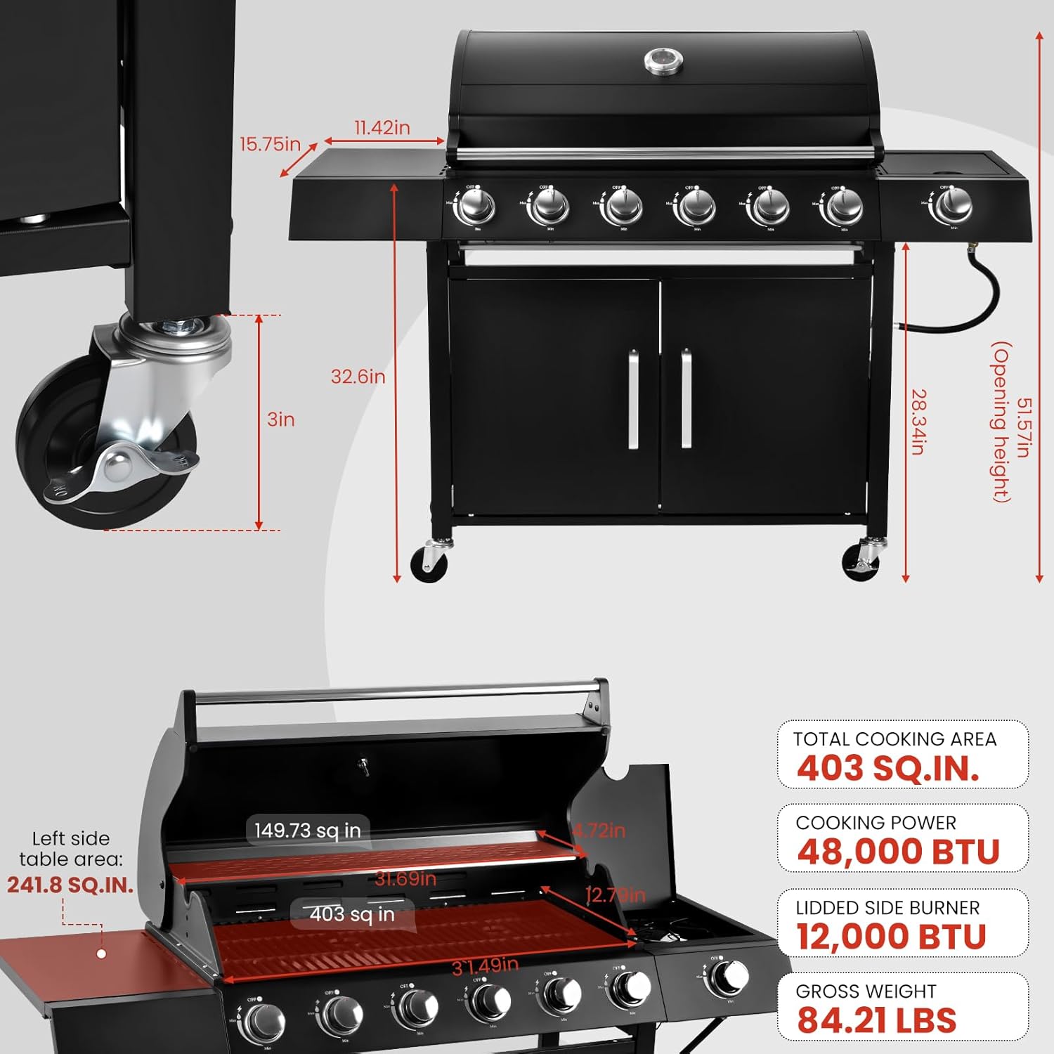 Q032-6-Burner w/Side Burner Gas Grill with 403 SQ.IN. Outdoor Grill with 60,000 BTU,Propane Grills with Top Cover Lid,Grills Outdoor Cooking for Patios,Balcony,Camping,Garden