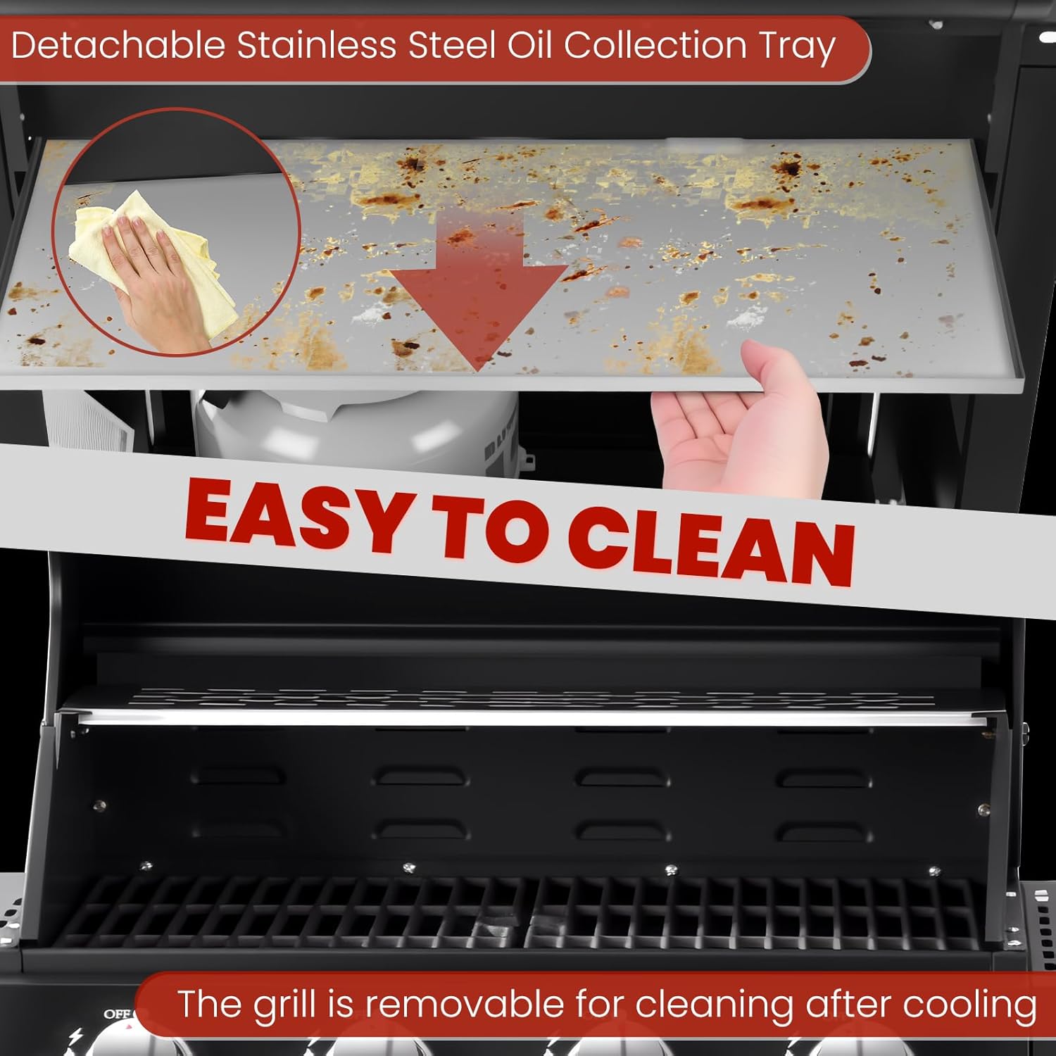 - ROLL ANYWHERE, GRILL ANYWHERE: Integrated propane tank holder; 4x3” swivel casters with locking wheels; slide-out drip pan for mess-free cleanup"