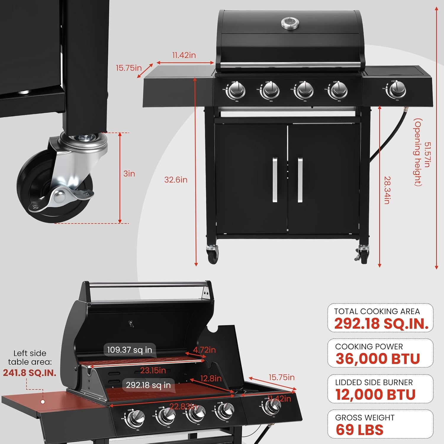 - 44,000 BTU FIREPOWER WITH SMART EFFICIENCY: 4x8,000 BTU vertical tube burners + 12,000 BTU side burner for total heat control (BTU measures energy use, not heat—efficient fuel consumption)