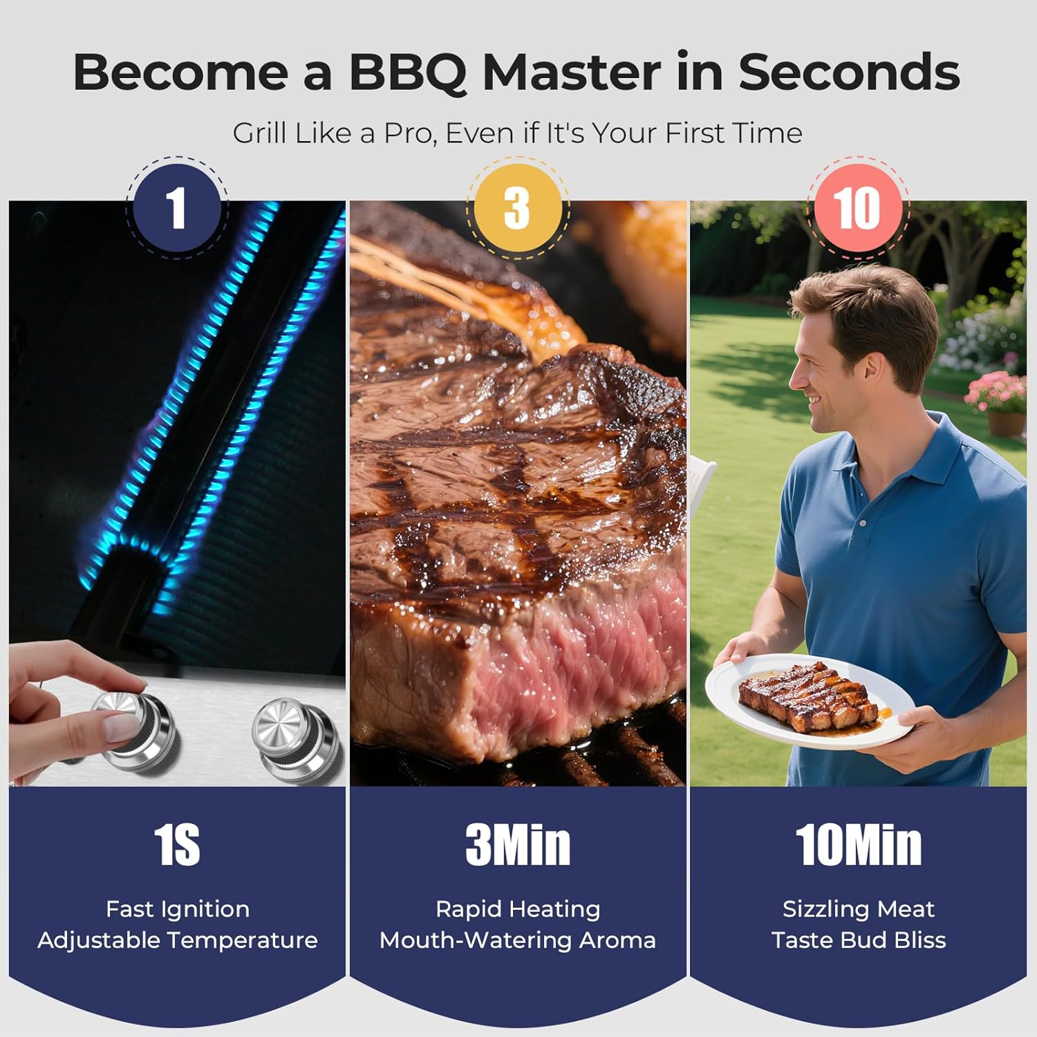 - Last-Long BBQ Grill: Experience the ultimate in outdoor grilling with our Premium Full Stainless Steel Grill. The BBQ grill (except the storage frame and door, which are made of 201 stainless steel) is crafted from food-grade 304 stainless steel – widely recognized as the industry's gold standard for corrosion resistance. Unlike inferior grills that use cheap 430 stainless steel or galvanized metals, our heavy-duty gas grill delivers a lifespan 1.5 to 7.5 times longer.