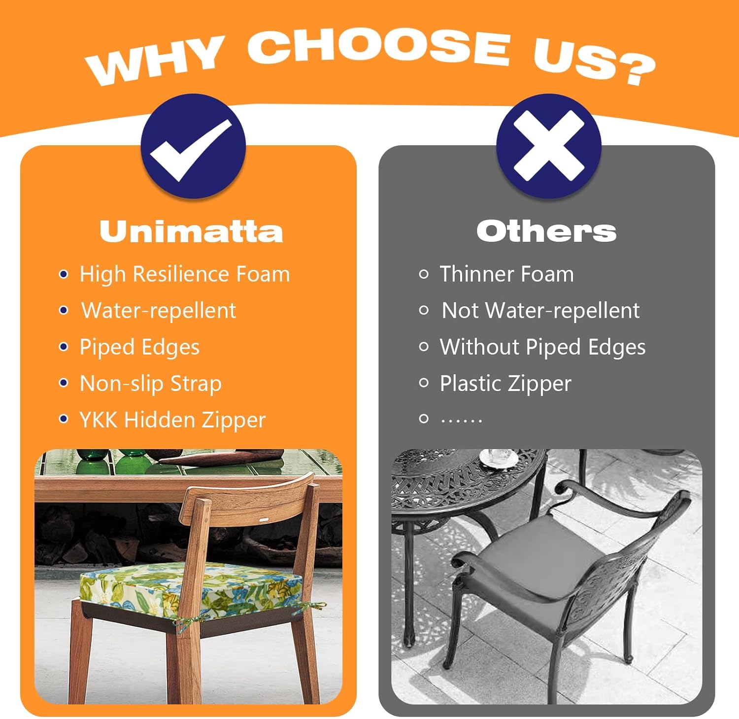 - 【High Resilience Foam】 The Unimatta chair cushions are filled with high-quality 100% foam, high-density sponge offers excellent support and long-lasing comfort. Whether you're enjoying a sunny afternoon or a cool evening, this cushion will keep you cozy.