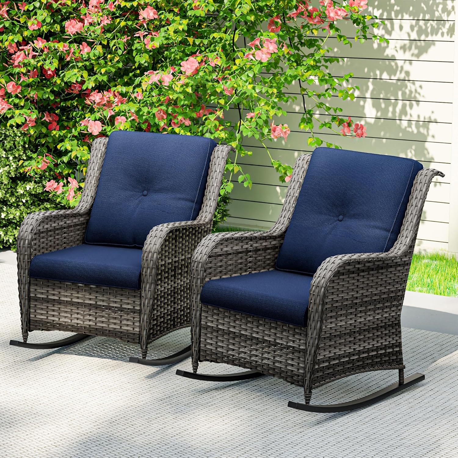 Outdoor Rocking Chair of 2, Wicker Patio Rocker Chair for Yard, Porch, Mixed Brown Grey Rattan, Blue Cushions