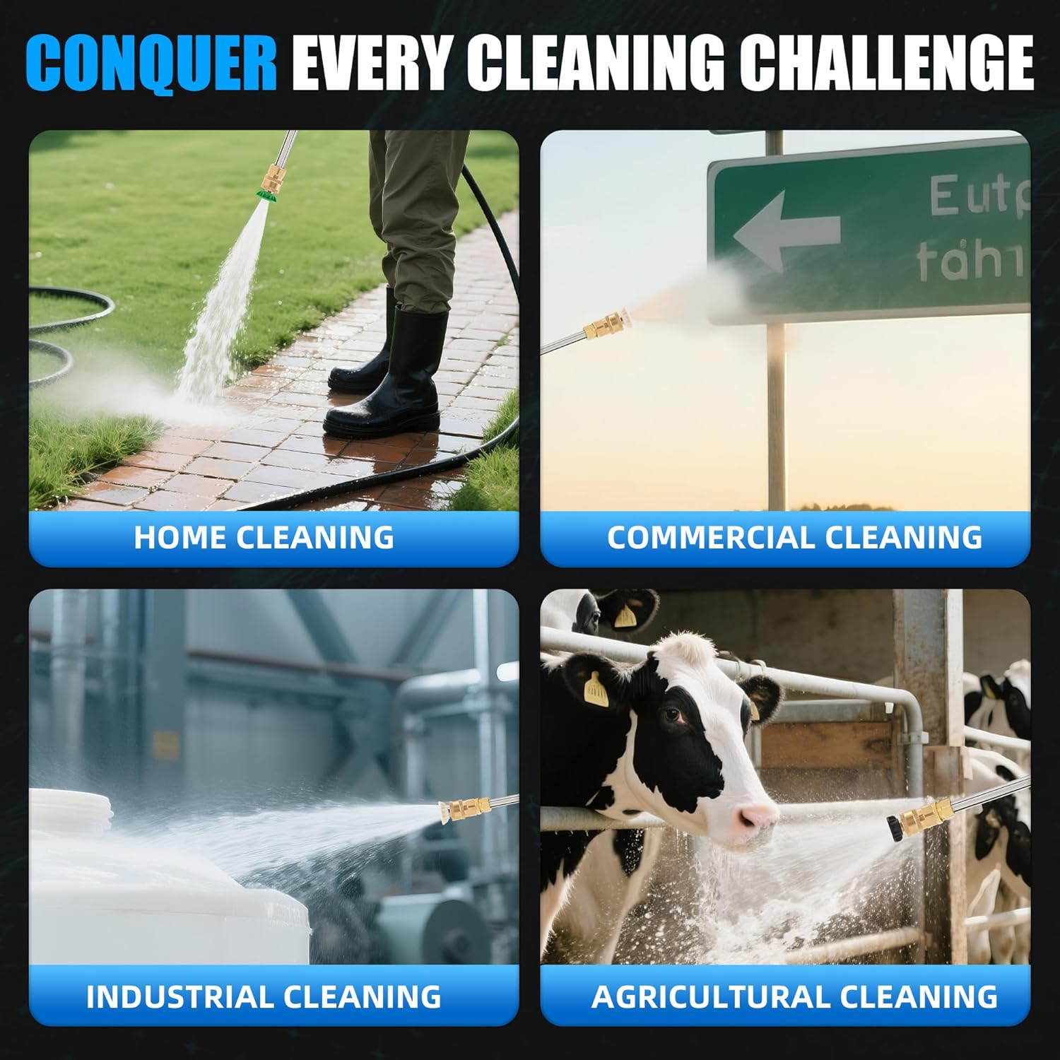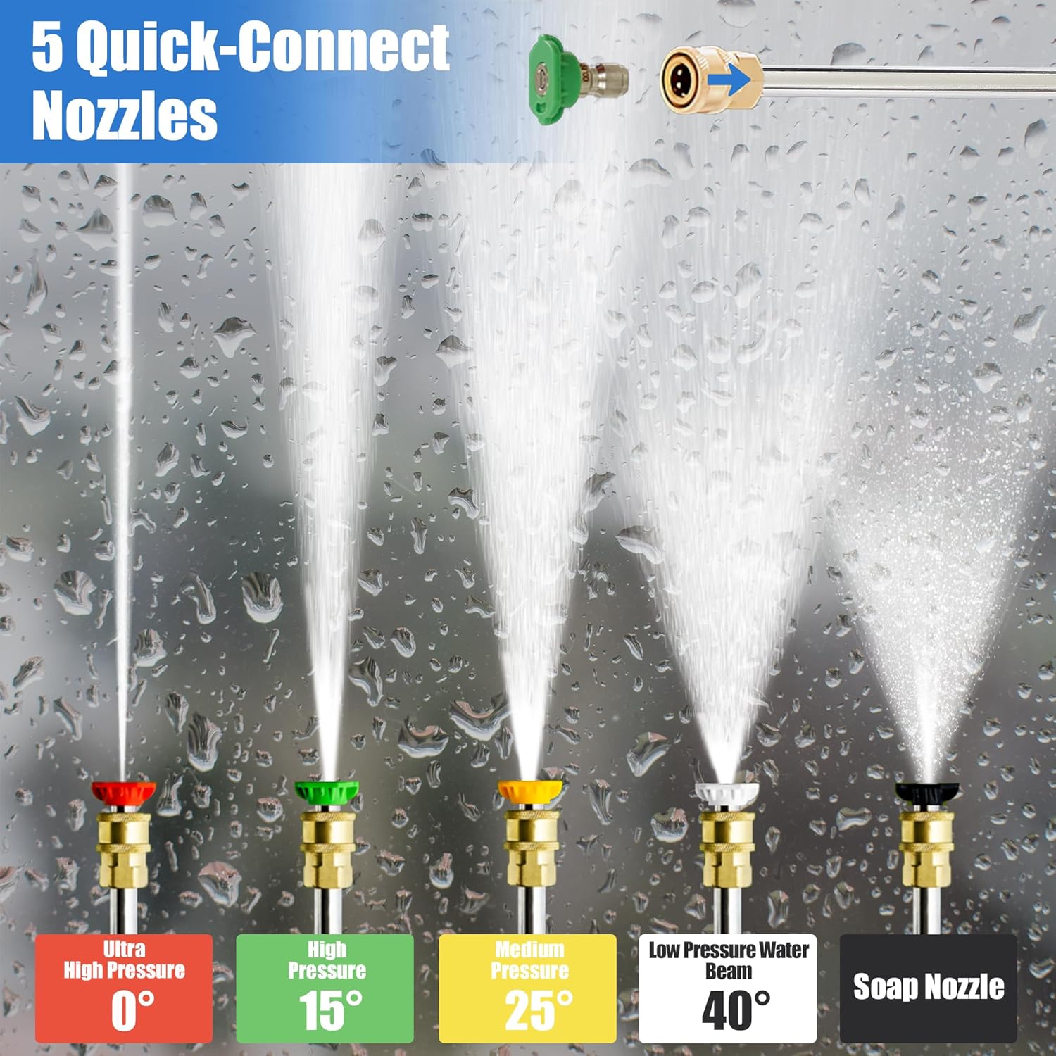 - ๐๐จ๐ฆ๐ฉ๐ซ๐๐ก๐๐ง๐ฌ๐ข๐ฏ๐ ๐๐ฅ๐๐๐ง๐ข๐ง๐ - This pressure washer has 4 quick-connect nozzle heads (0ยฐ, 25ยฐ, 40ยฐ, and soap) ranging from high-impact water jets to soft dispersion, perfect for cleaning decks, cars, house exteriors, outdoor furniture, and preparing your house exterior for painting. It can effectively remove dirt and grime from any surface in a short time.