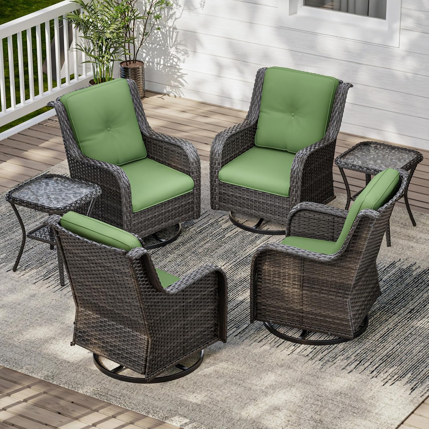 6 Pieces Outdoor Furniture Set - Patio Wicker Swivel Rocker Chair Set of 4 and 2 Side Table, Green, Mixed Brown Rattan, Suitable for Porch, Yard