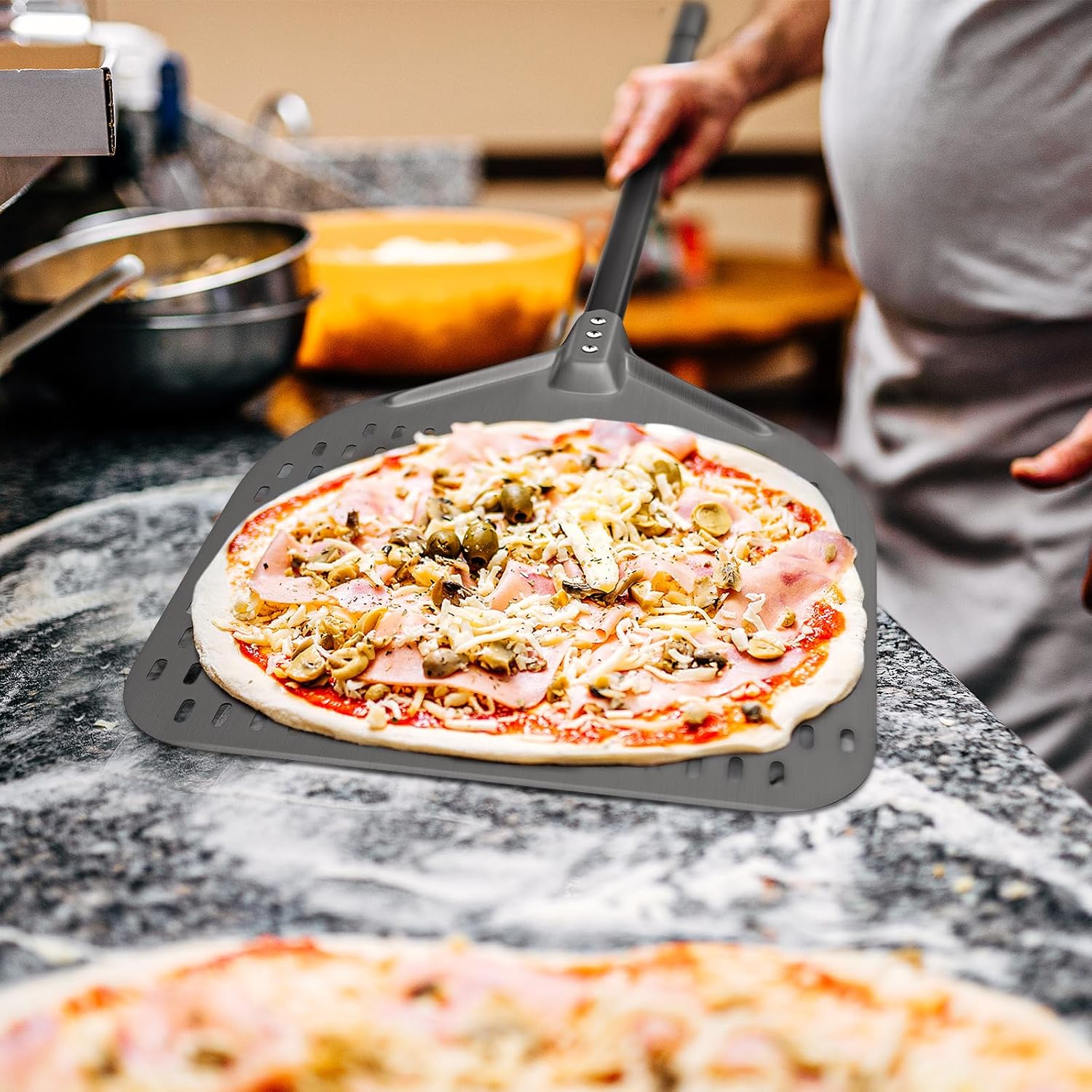 - 【PREMIUM QUALITY】Crafted from hard anodized aluminum, our pizza peel protects your dough from oxidation. The durable pizza paddle is designed to last 6 to 8 times longer than standard pizza peels, ensuring you have a reliable kitchen tool for years to come