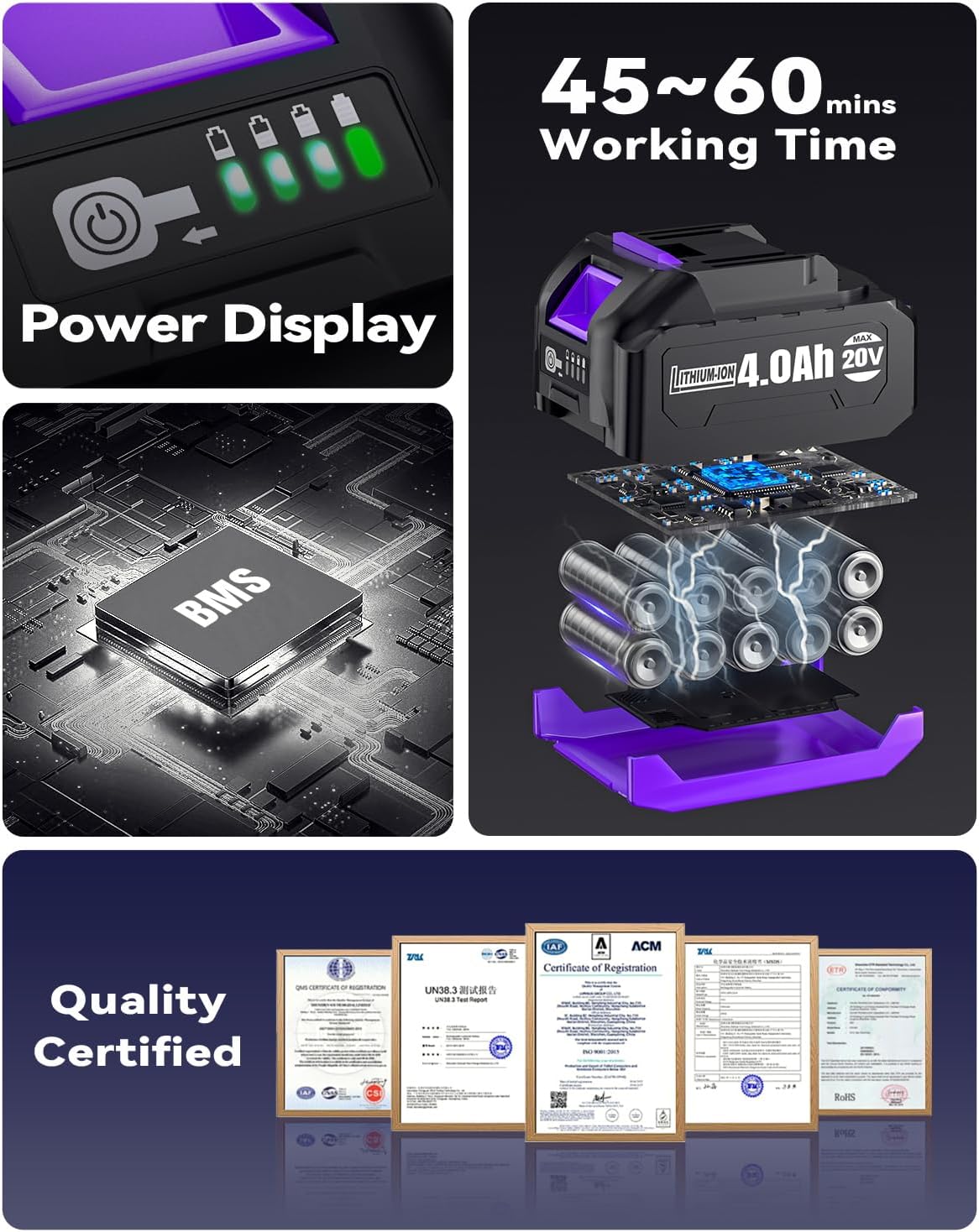 - [SmartBMS] Professionally certified battery with 14-layer Protection Matrix via advanced BMS. Each 4.0Ah battery supports actual work for 45-60 mins