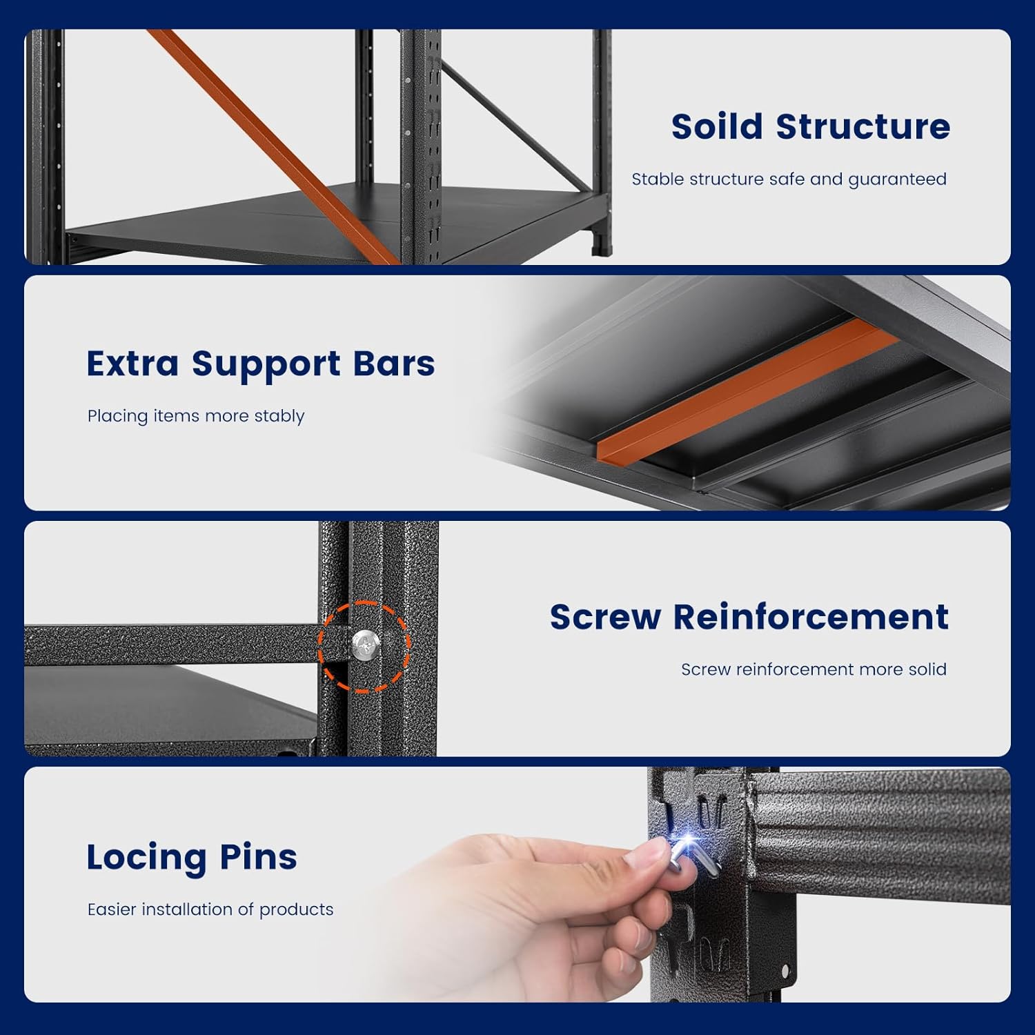 - 【Adjustable 4-Tier Shelving】Our heavy duty storage shelves are as flexible as your plans.This garage shelves height of each layer could adjustable by moving the crossbar up or down,to meet the different heights of varied objects needed and customize your own space!