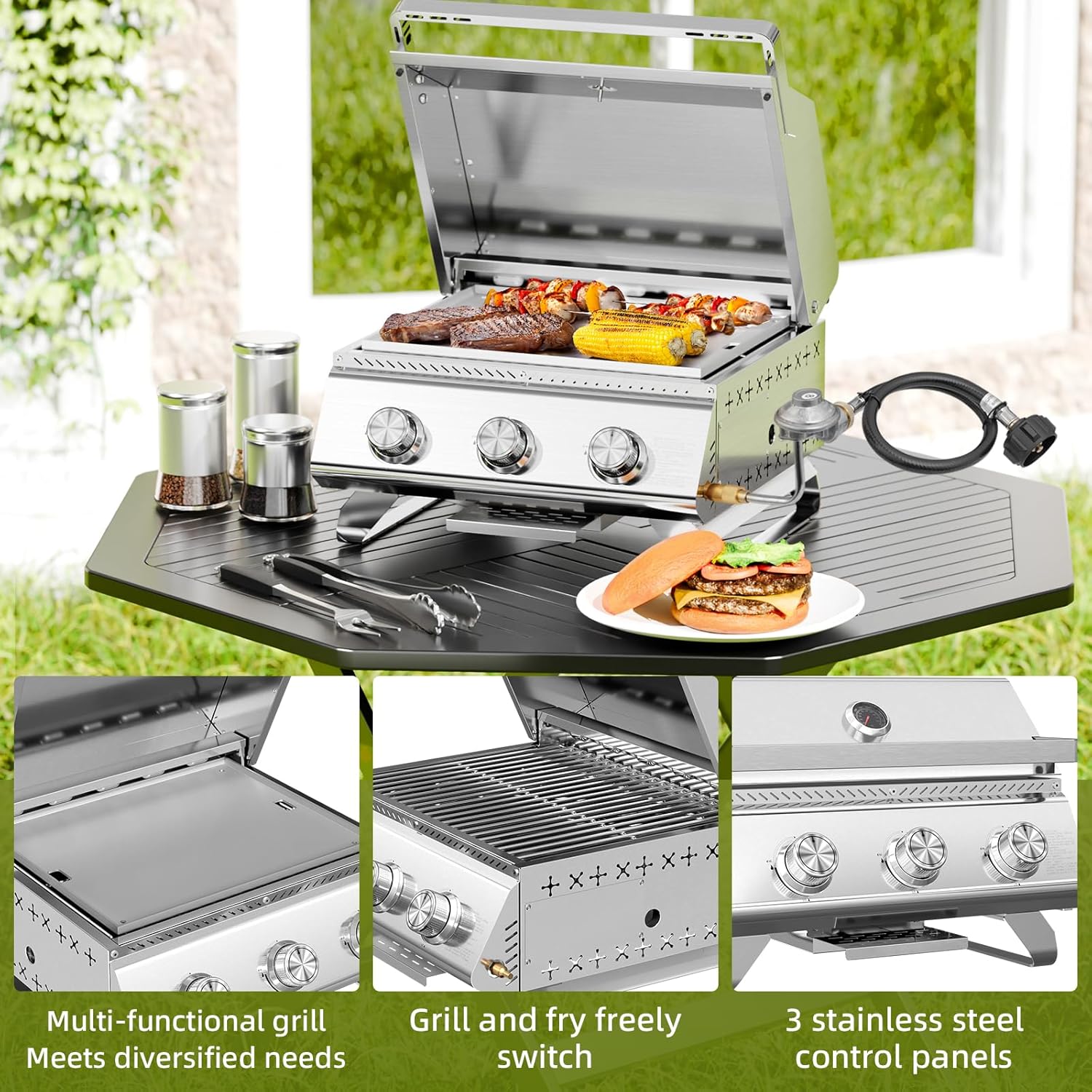 - 3*8,000 BTU BURNERS: Featuring three powerful stainless-steel burners, each with 8,000 BTUs of heat. With twist start ignition and independent control knobs, you can freely control the heat to let your food in a good mood.