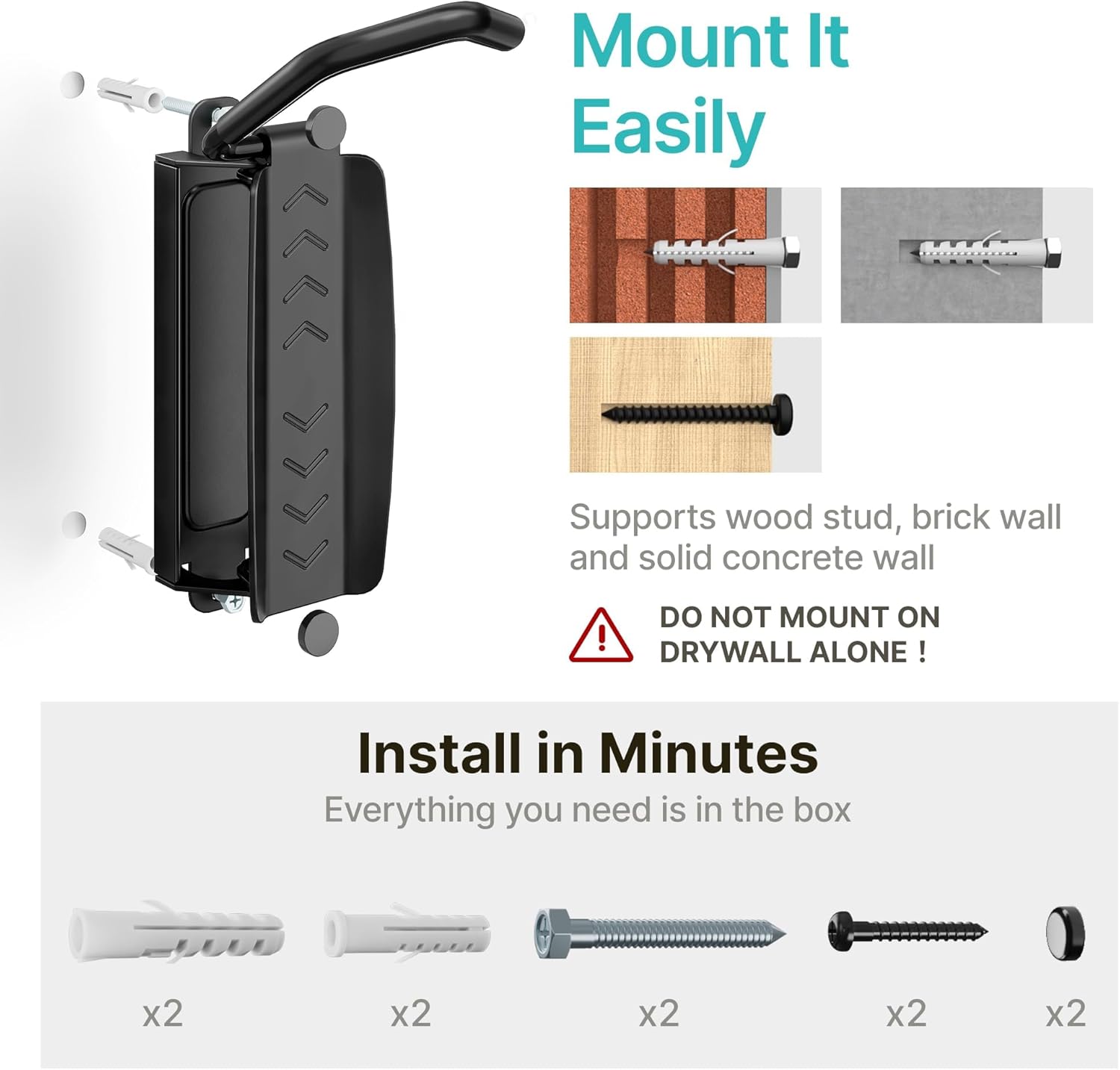 - 【Installation】Set the bike holder garage at the correct height, have a family member help lift and position it, then rotate it to the perfect angle. Set it up once and enjoy a relaxed experience—indoors or outdoors. IMPORTANT: Only mount the bike rack garage on a solid stud, beam, masonry, or concrete wall. It should never be installed on unsupported surfaces, such as plasterboard walls, unless a strong wooden stud is located behind them.
