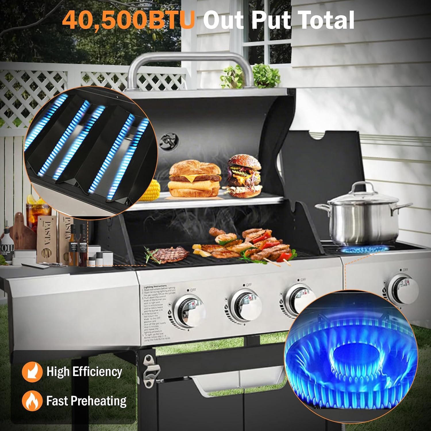 3-Burner Propane Gas Grill with Side Burner, 40,500 BTU Stainless Steel BBQ - Easy Assembly & Grease Management for Patio, Backyard, Camping (3+1Burner)
