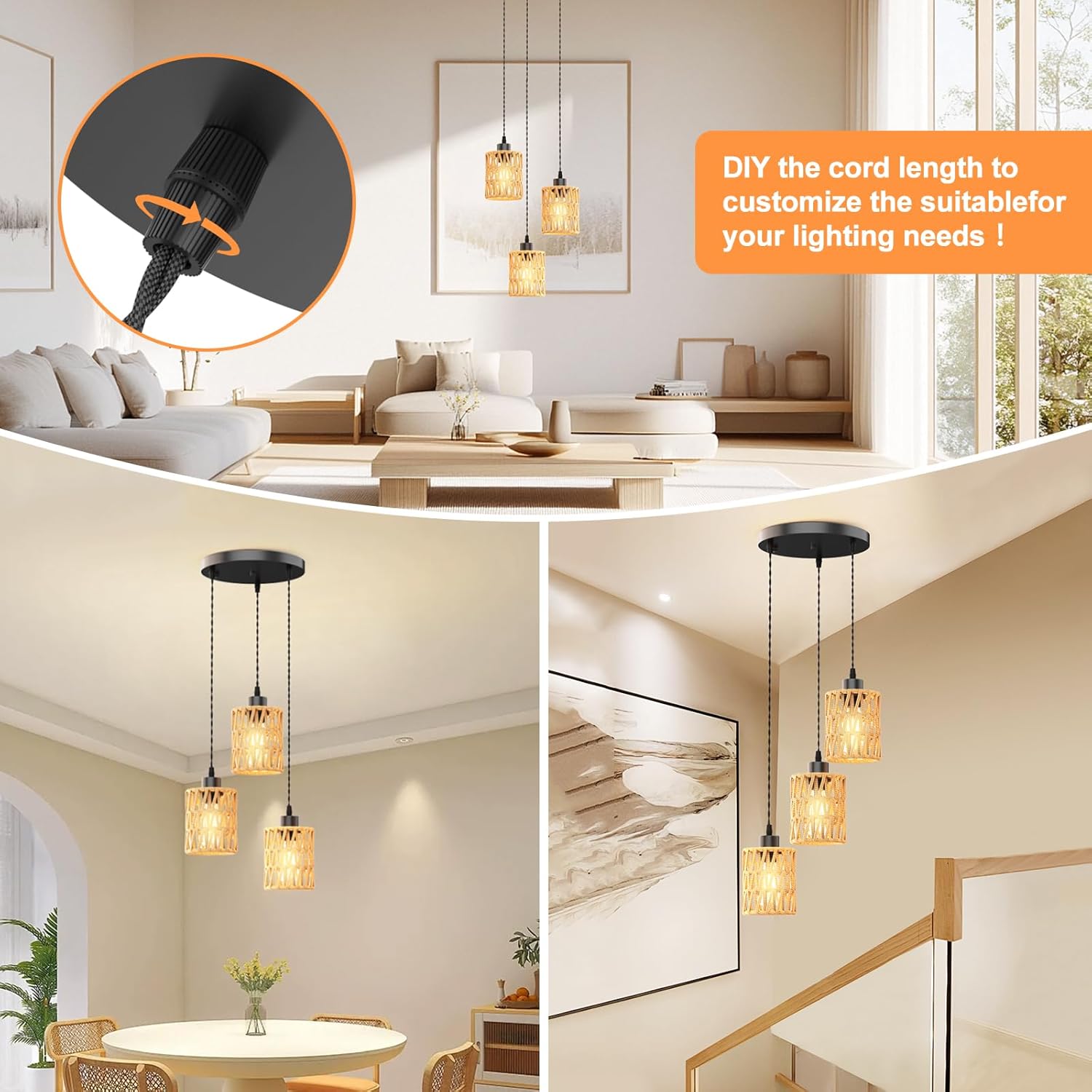 - 📏 【Adjustable Height & Versatile Placement】The rattan light fixture has a 4.7-inch diameter shade with an adjustable cord (9.8"–71"),fitting both flat and sloped ceilings.Perfect for hallways,entryways,living rooms,bedrooms,porches,kitchens,and dining areas,this wicker pendant light becomes a stylish focal point in any room.