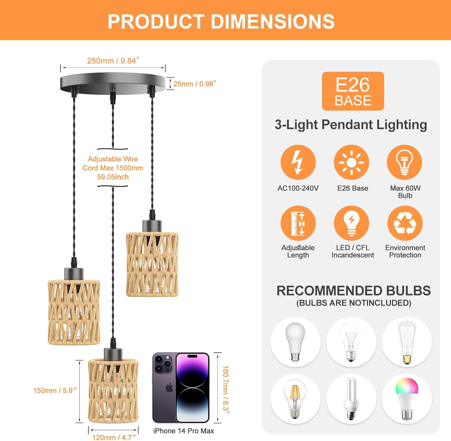 - 💡 【UL-Certified Socket& Bulb Compatibility】This E26 socket pendant light is UL-listed for safety and works with LED,incandescent,vintage filament,and halogen bulbs (max 60W). Choose warm white (2700K–3000K) for a cozy glow or bright white (4000K–5000K) for task lighting—bulb not included.