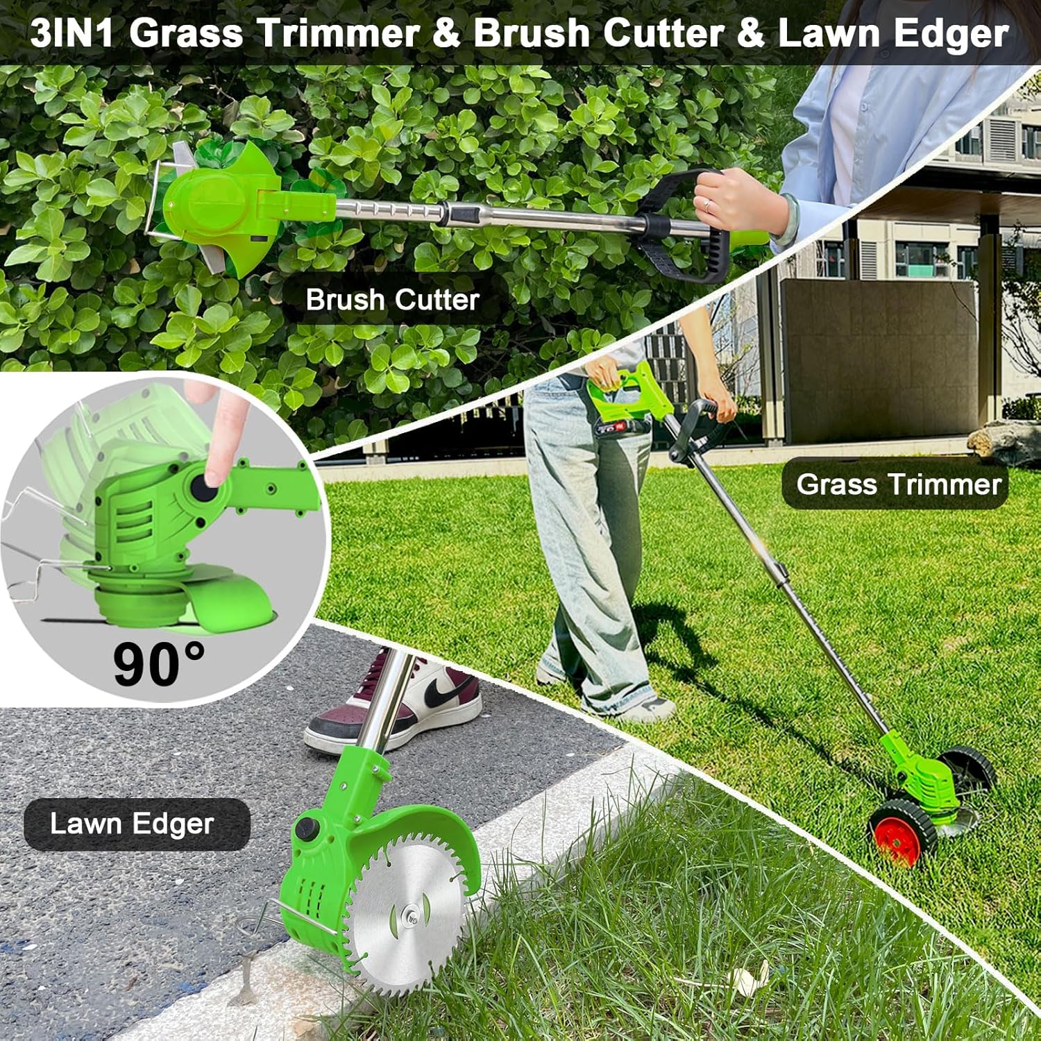 - 【Electric Weed Wacker with Wheels】Upgraded multifunction 3-in-1 cordless weed wacker, grass trimmer, brush cutter, not limited by wires, you can mow anywhere. Easy for different cutting jobs. Equipped with removable wheels, weeding is as easy as walking, improving work efficiency, saving time and effort