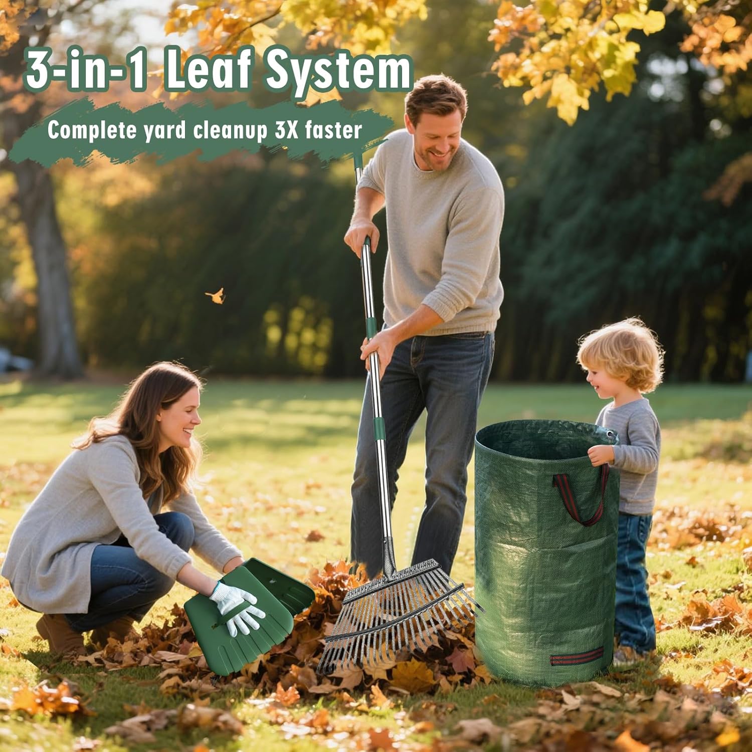 - 【65" 3-in-1 Leaf System】Rake, Scoop & Bag Combo 25-tine heavy-duty rake + leaf grabber claws + 32-Gallon storage bag! Effortlessly collect, grab, and bag leaves in one seamless process – no more bending or hand-scooping. Complete yard cleanup 3X faster.