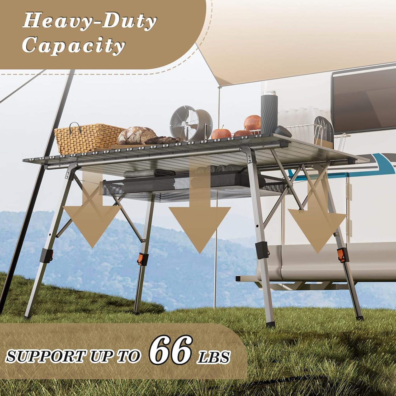 - Easy to Set Up: This folding camping table takes just minutes to unfold and get ready for use, making it perfect for camping and outdoor activities. Extra storage mesh layer which under the tabletop provides more space and holds more stuff for you.