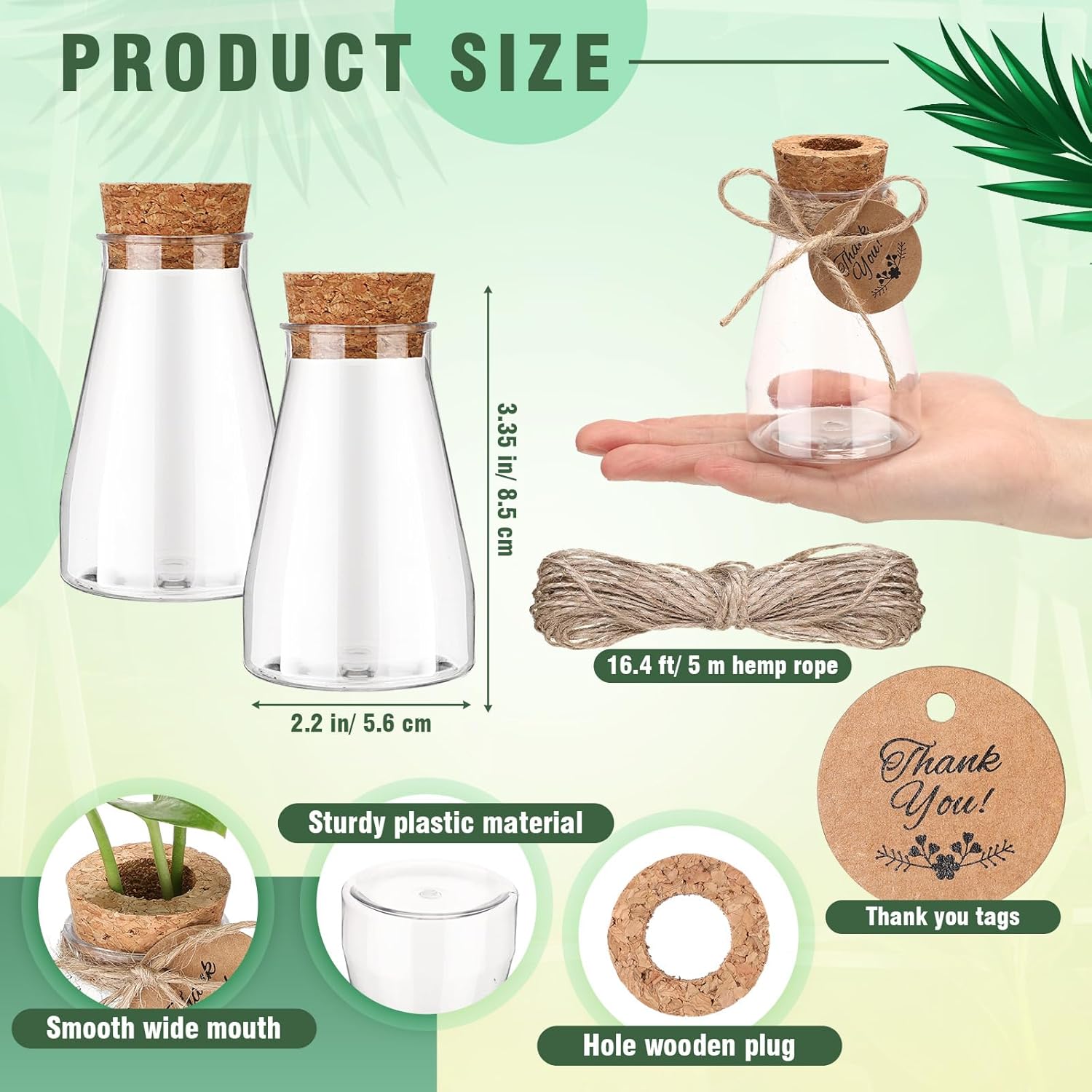 - Multiple Combinations: including 48 plastic plant cultivation bottles, 48 perforated wooden plugs, 50 thank you tags, and 32.81 ft/ 10 m hemp rope, which can meet your various plant needs and are suitable for plant lovers; The transparent material can observe the growth of plants and changes in water levels, and the appropriate size also provides space for plant growth