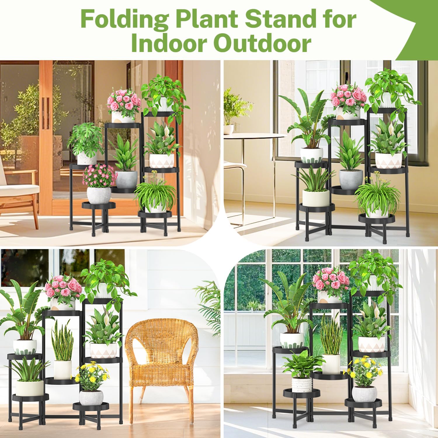 iDavosic.ly 7 Tier Folding Plant Stand Indoor Outdoor with Plastic Tray, Tiered Corner Flower Holder Shelf, Metal Orchid Display Rack for Patio Porch Living Room Garden Balcony, Modern Black