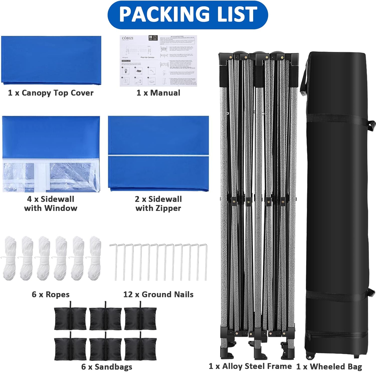 COBIZI 10x20 Pop Up Canopy with 6 Sidewall,Heavy Duty Canopy UPF 50+ All Season Wind Waterproof Commercial Outdoor Wedding Party Tents for Parties Gazebo with Roller Bag(10 x 20 ft Blue)