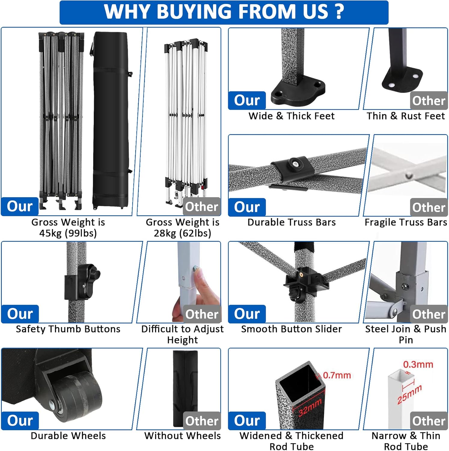 - 【3 Height Settings】10x20 pop up party tent straight leg has 3 height settings. Thumb latch lock system easy to lock and release, raise the pop up tent to a desired height. Canopy tent 10x20 straight leg height options: 220cm/86.6inch, 230cm/90.6inch, 240cm/94.5inch. Corresponding party tent center height options: 310cm/122.0inch, 320cm/126.0inch, 330cm/129.9inch. 10x20 canopy with sidewalls perfect for commercial activities, camping, festivals, tailgating, backyard events and etc..