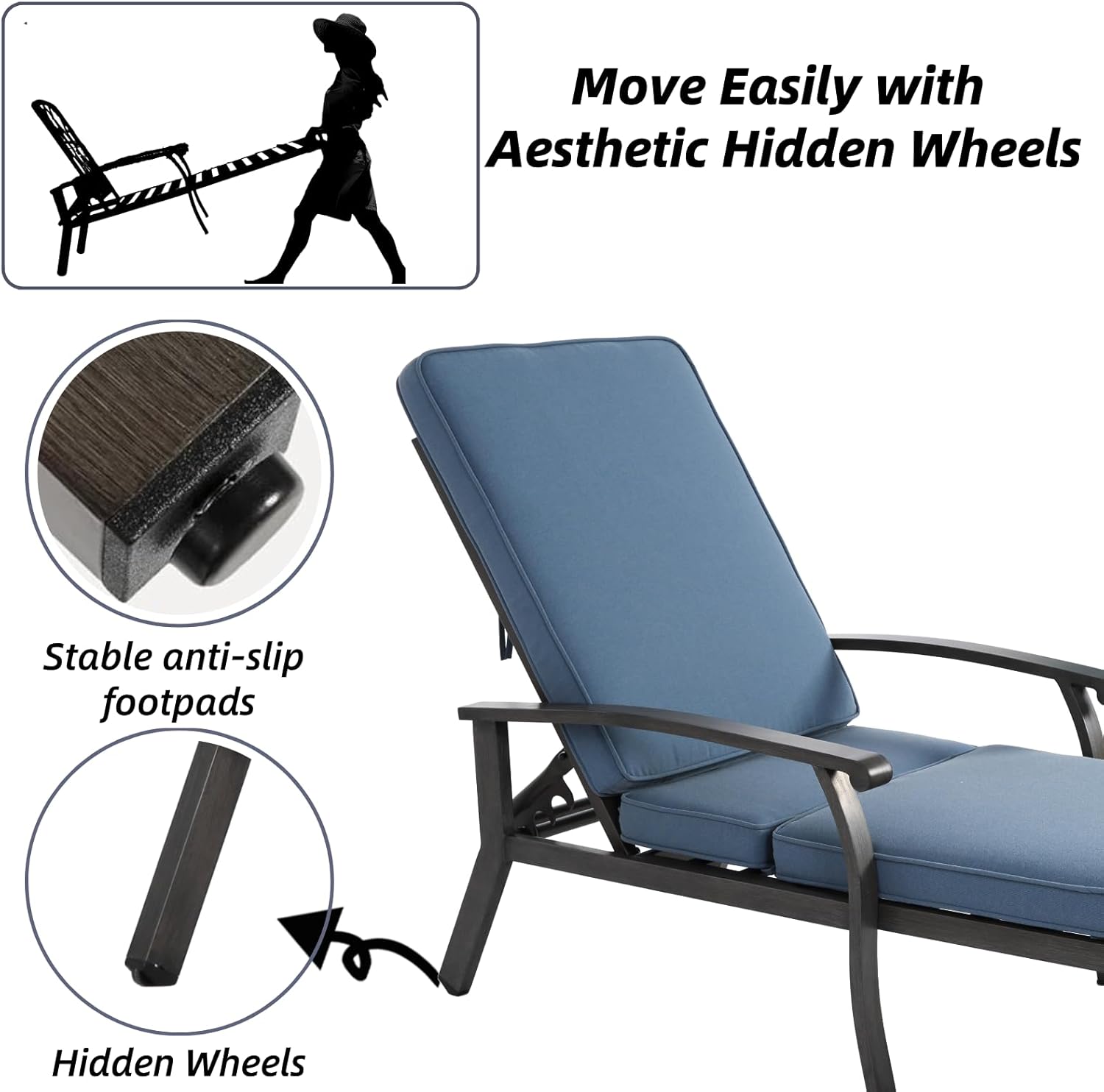 Outdoor Chaise Lounge with 5-Level Adjustable Backrest Set of 2, Durable Aluminum Patio Chair with Waterproof Cushion & Wheels for Garden, Poolside, Blue