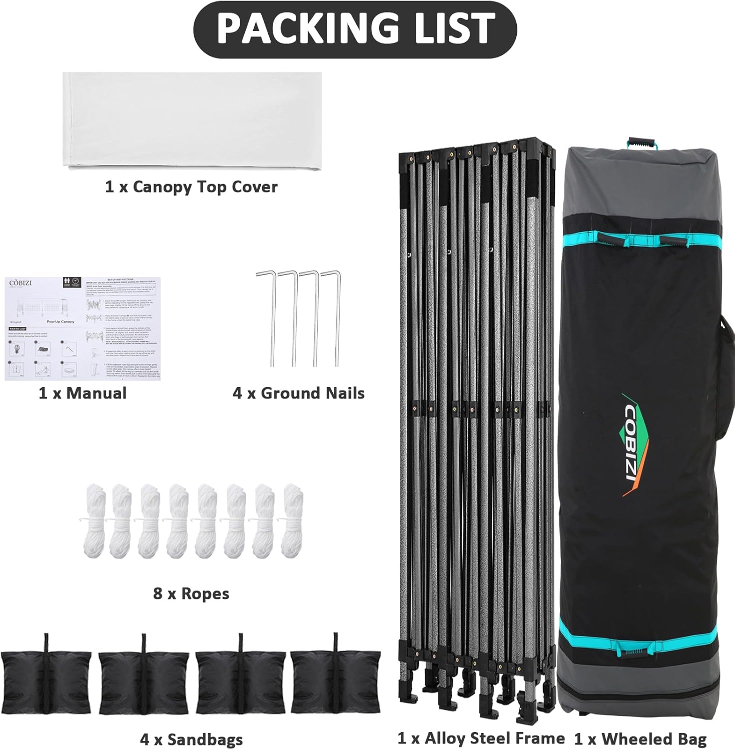 - 【300 SQ Feet Shade Area】COBIZI 10x30 pop up tent provides 300 SQFT spacious covered space, it can easily accommodate 15-20 people, meet your different needs for holding large gatherings. Perfect for wedding, birthday party, market event and other larger events. When in use, always secure the 10x30 pop up tent with the included stakes and ropes to avoid damage. One year after-sale protection for canopy frame; Six months after-sale protection for fabrics and accessories.
