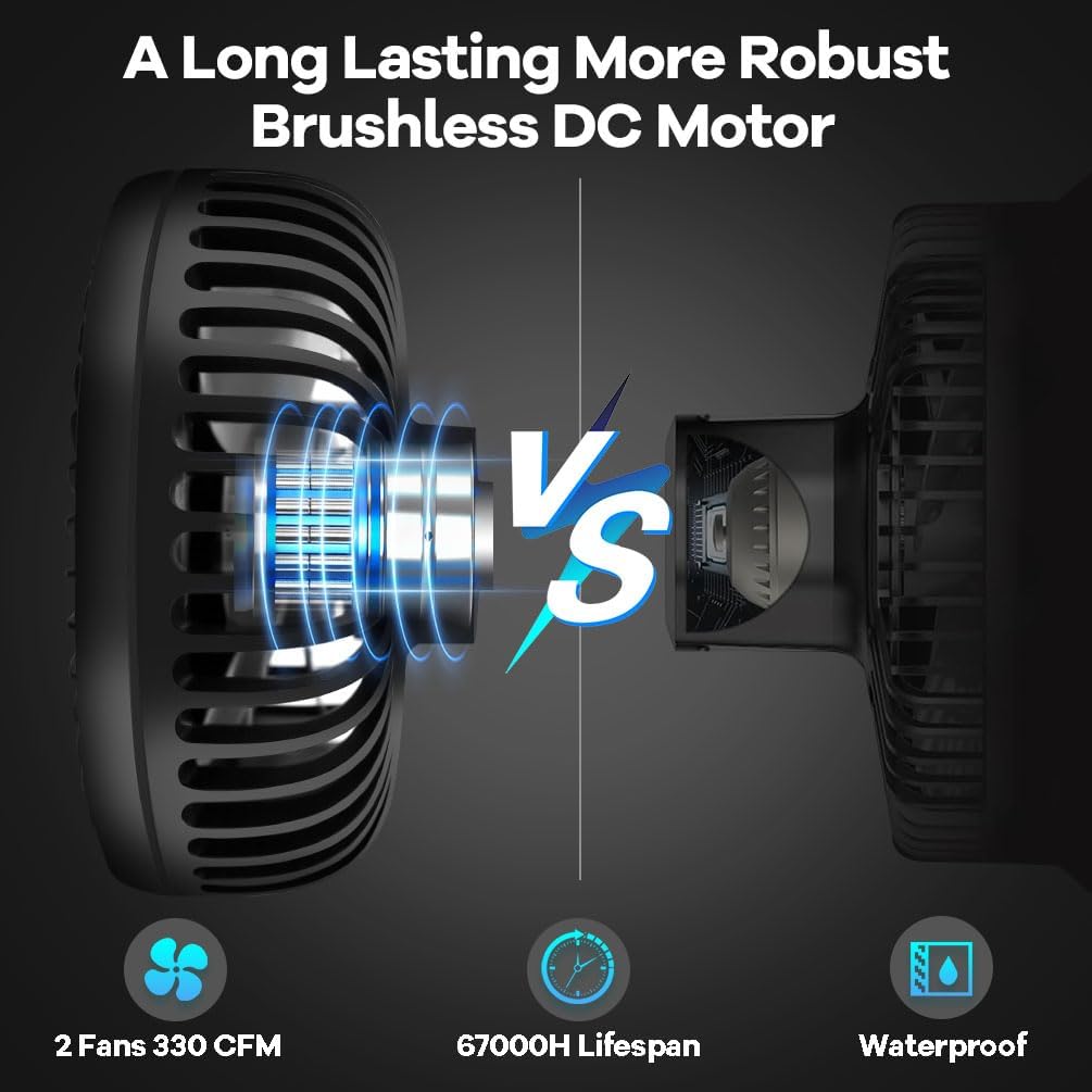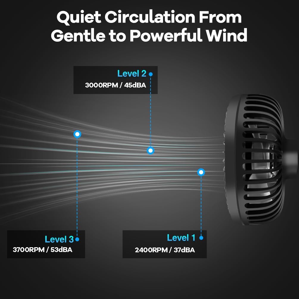 - Strong Airflow with Few Noise: The clip on double fans equipped with a 12W adapter can output max airflow 330CFM 3700 RPM with a few noise of 53dBA. In the lower speed level, the noise decrease to 37dBA. Also it’s IP54 waterproof which can work in a humidity environment.