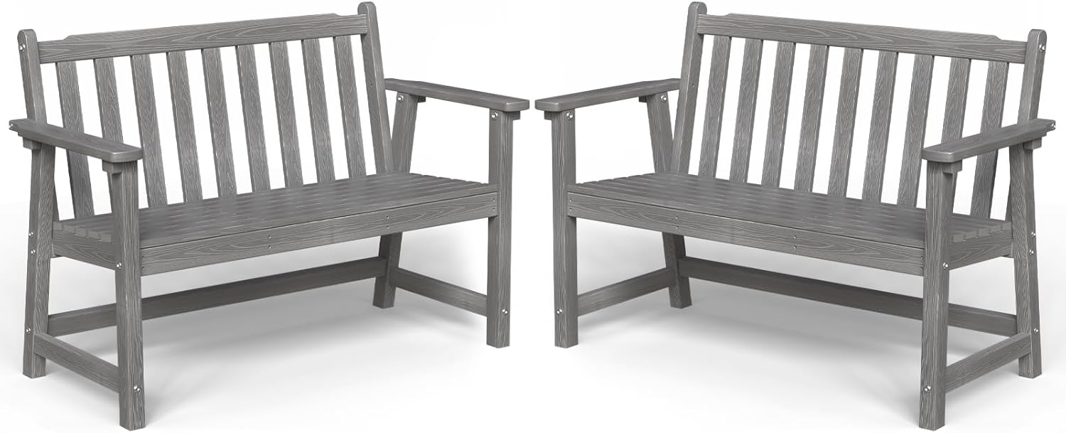 Outdoor Bench, 2-Person HDPE Garden Bench, All Weather Poly Patio Bench for Outdoors, Garden, Backyard, Porch and Park, 550 lbs Weight Capacity, Grey, 2 Pack