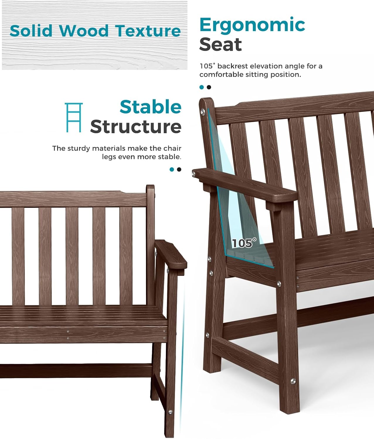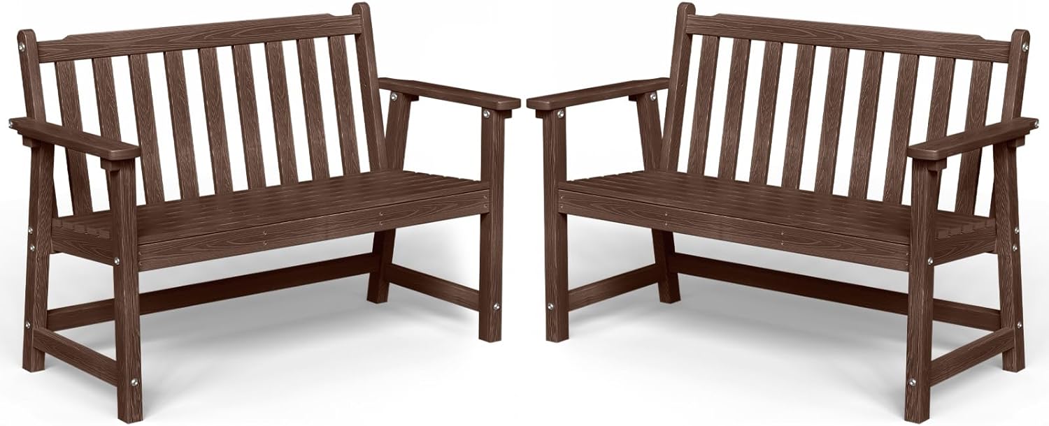 Outdoor Bench, 2-Person HDPE Garden Bench, All Weather Poly Patio Bench for Outdoors, Garden, Backyard, Porch and Park, 550 lbs Weight Capacity, Brown, 2 Pack