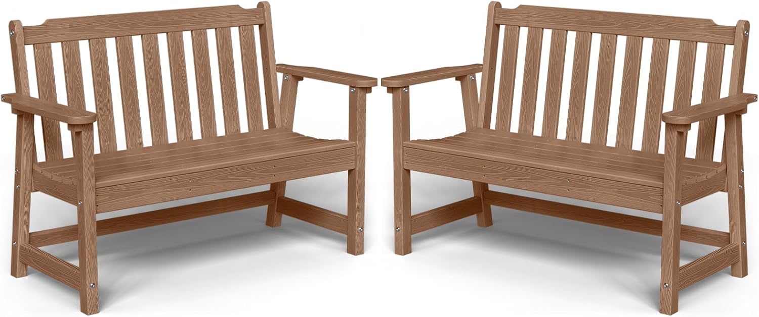 Outdoor Bench, 2-Person HDPE Garden Bench, All Weather Poly Patio Bench for Outdoors, Garden, Backyard, Porch and Park, 660 lbs Weight Capacity, Teak, 2 Pack