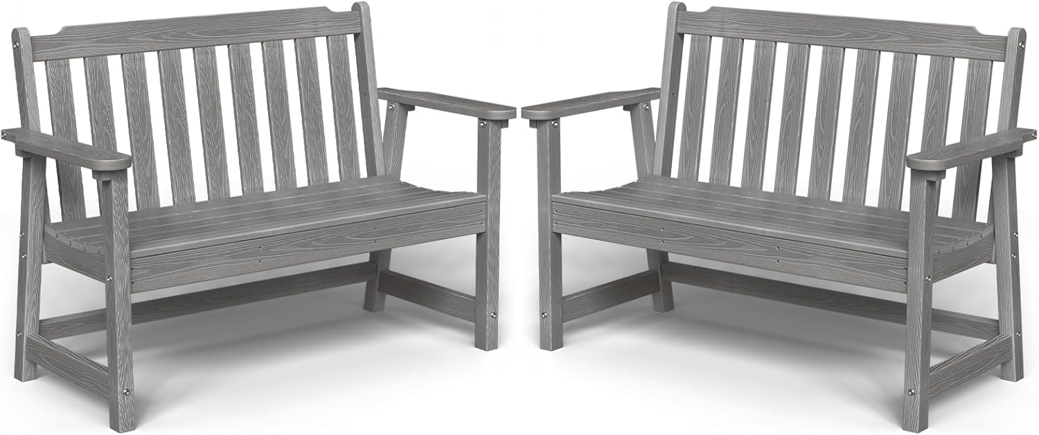 Outdoor Bench, 2-Person HDPE Garden Bench, All Weather Poly Patio Bench for Outdoors, Garden, Backyard, Porch and Park, 660 lbs Weight Capacity, Grey, 2 Pack