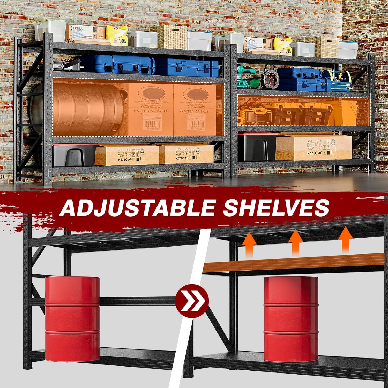 - 【75" W x 24" D x 70" H Extra Wide& Large Heavy Duty Shelving】 We have newly designed the load-bearing structure of this shelf and widened the metal shelves, making it suitable for use in outdoors, garages, warehouses, commercial spaces, storage rooms, kitchens, basements, offices, and other areas. The four-tier garage shelf not only expands your storage space but also helps maintain a tidy and organized living environment.