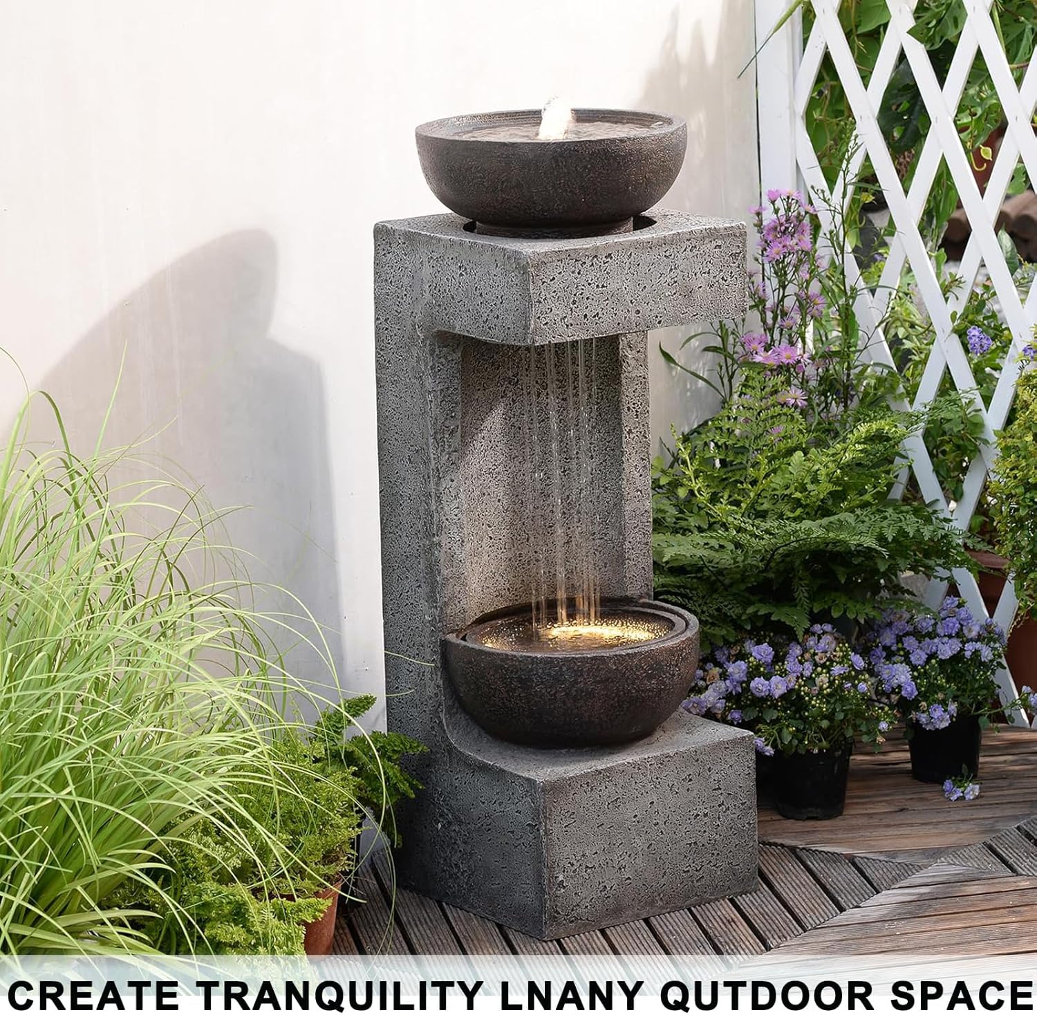 - Weather-Resistant Resin for Year-Round Use: Crafted from high-quality resin and fiberglass, this outdoor waterfall fountain is built to withstand sun, rain, and temperature changes. The realistic grey stone-look finish blends effortlessly into both modern and natural outdoor settings, adding timeless charm to your patio or garden. (For winter months in freezing climates, we recommend moving the fountain indoors to prevent ice damage.)