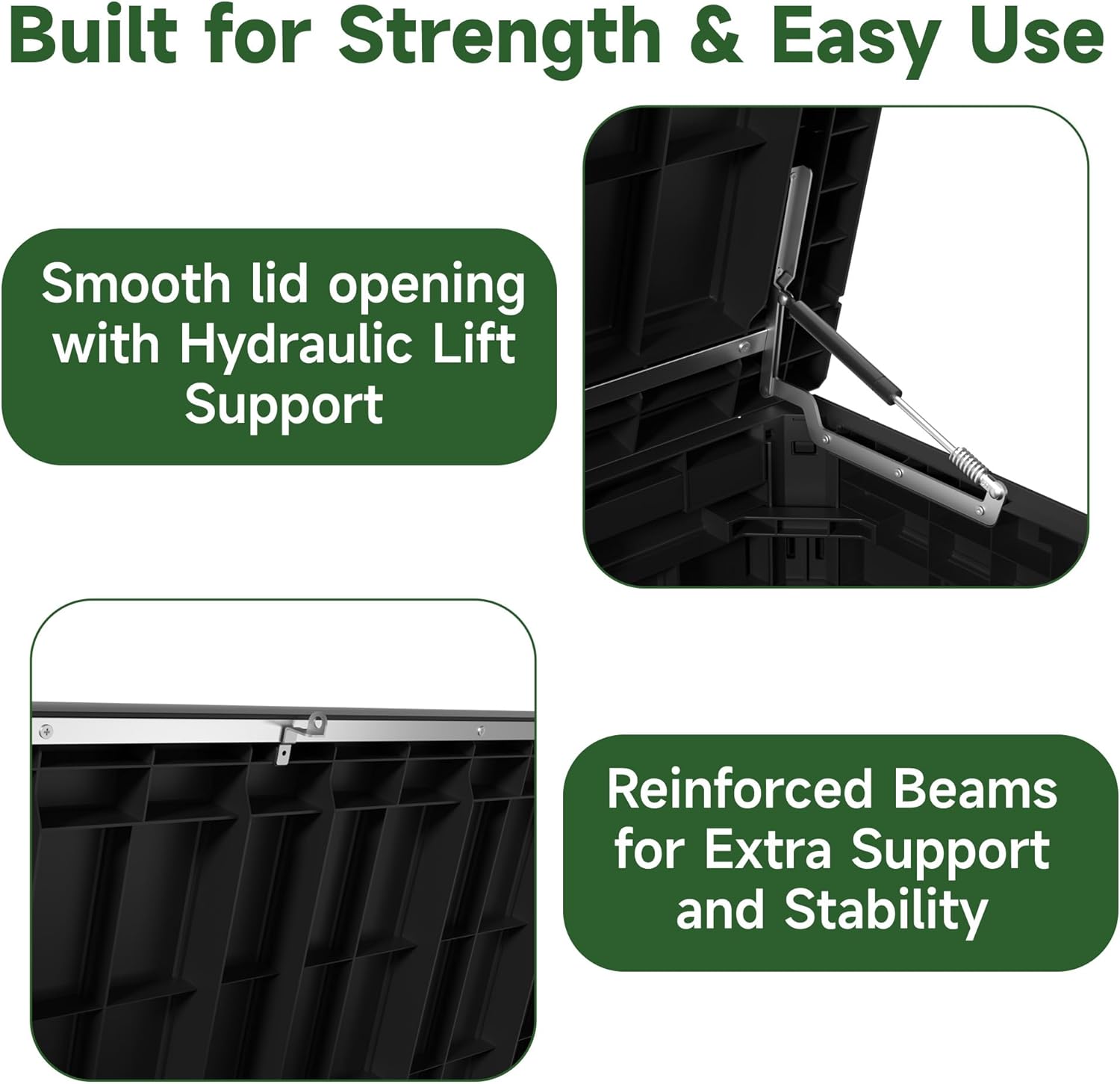 - SAFETY & LOCKABLE DESIGN - Equipped with a hydraulic rod, this storage box ensures smooth and safe lid operation, preventing accidental pinching. The built-in lockable design provides an additional layer of security, keeping your outdoor valuables safe and protected.