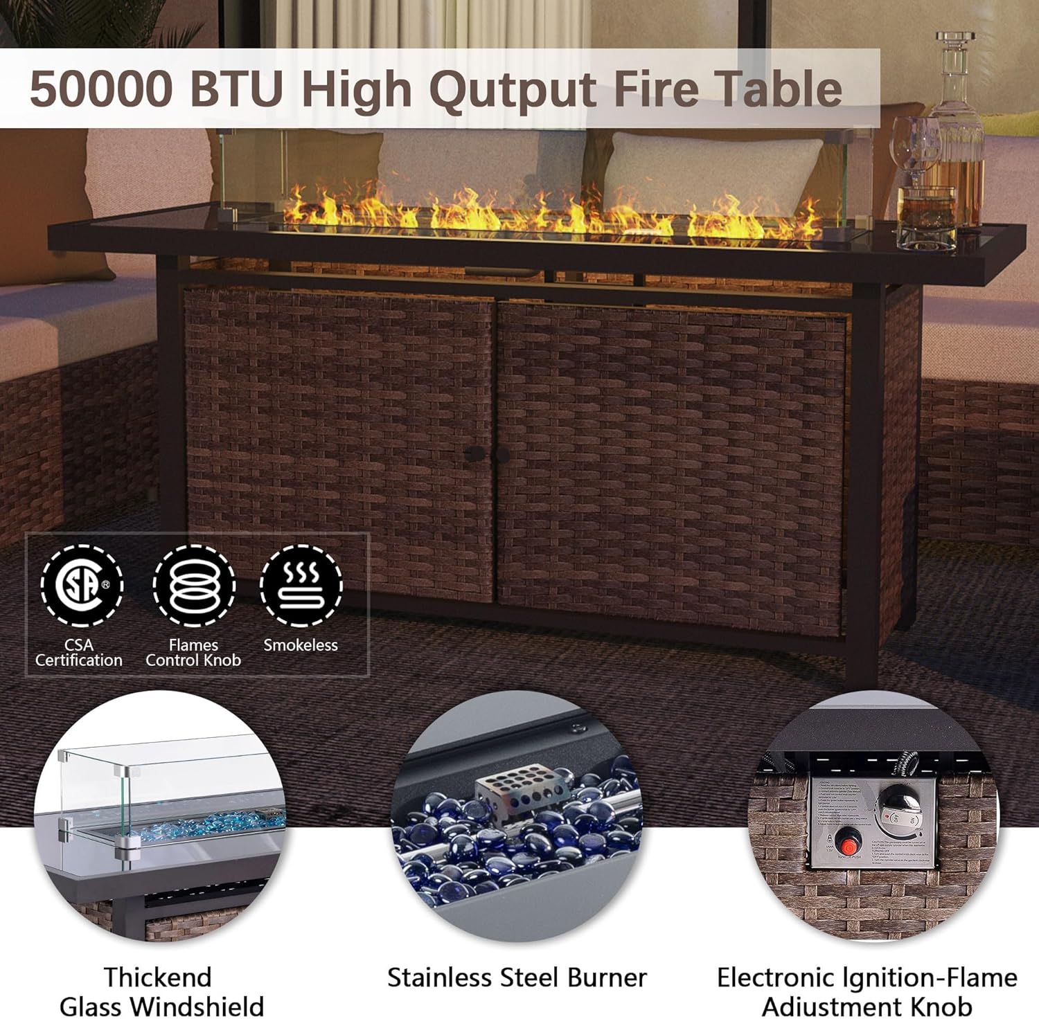 - 【Complete 25-Piece Set】 Includes 8 main furniture (1 Fire Pit Table + 1 Coffee Table + 2 Arm Chairs + 4 Armless Chairs) & 17 premium accessories (6 Seat Cushions + 8 Back Cushions + 2 Pillows + 1 Glass Windshield). Everything needed for instant outdoor living