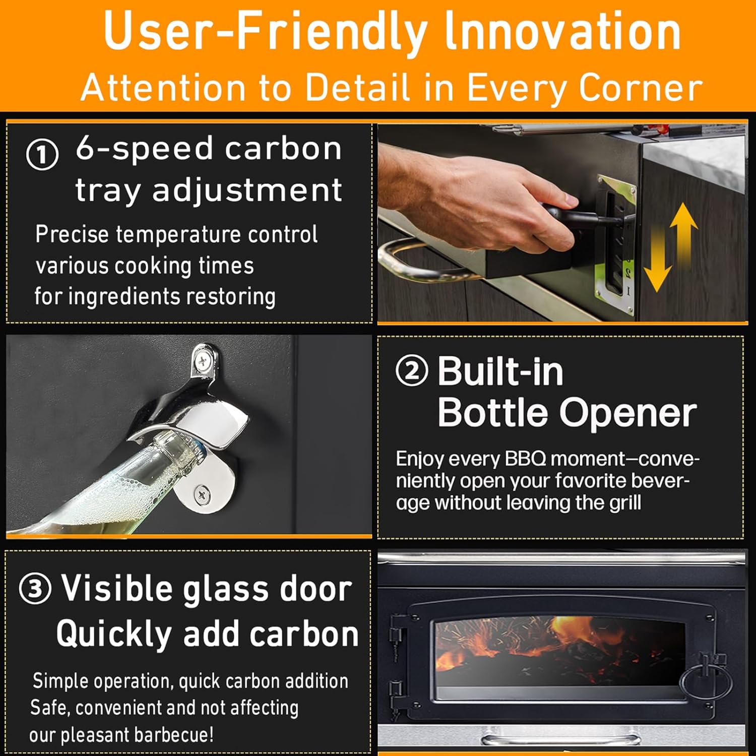 - Visible glass window- Quick carbonization:The operation is simple, charcoal is added quickly, and it is safe, convenient and does not affect our pleasant barbecue!