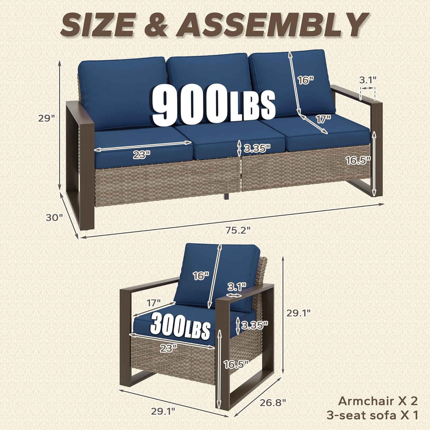 - DEEP SEATING & SPACIOUS ROOM: The wicker patio furniture set feature an extended seat panel, providing a snug feel while seated. There is ample space for an adult to sit and move around naturally