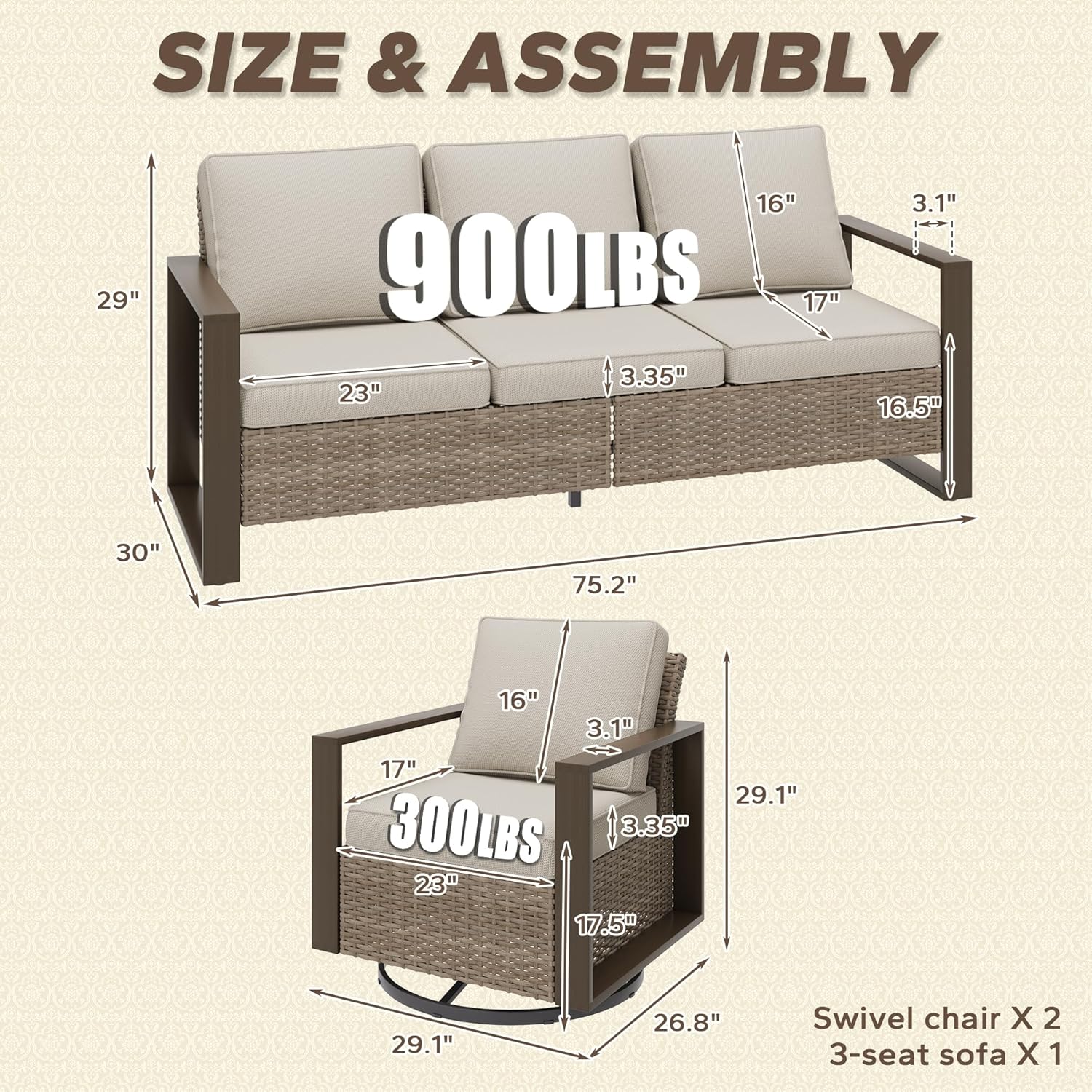 - Size : 3 PCS Sofa & Swivel Chairs Set