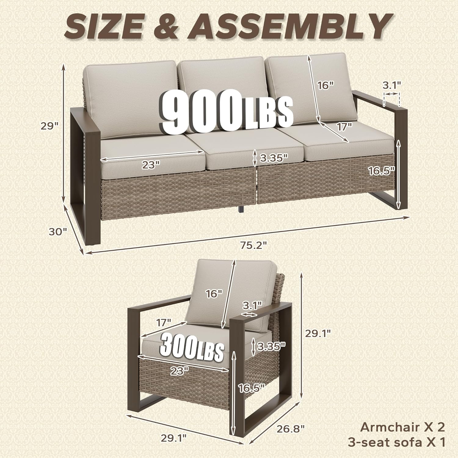 Wicker Patio 75" Sofa Set with Two Armchairs, All Weather Rattan Outdoor Conversation Furniture Set with Wood-Looking Metal Armrest & Removable Cushions for Deck Backyard Porch, Beige